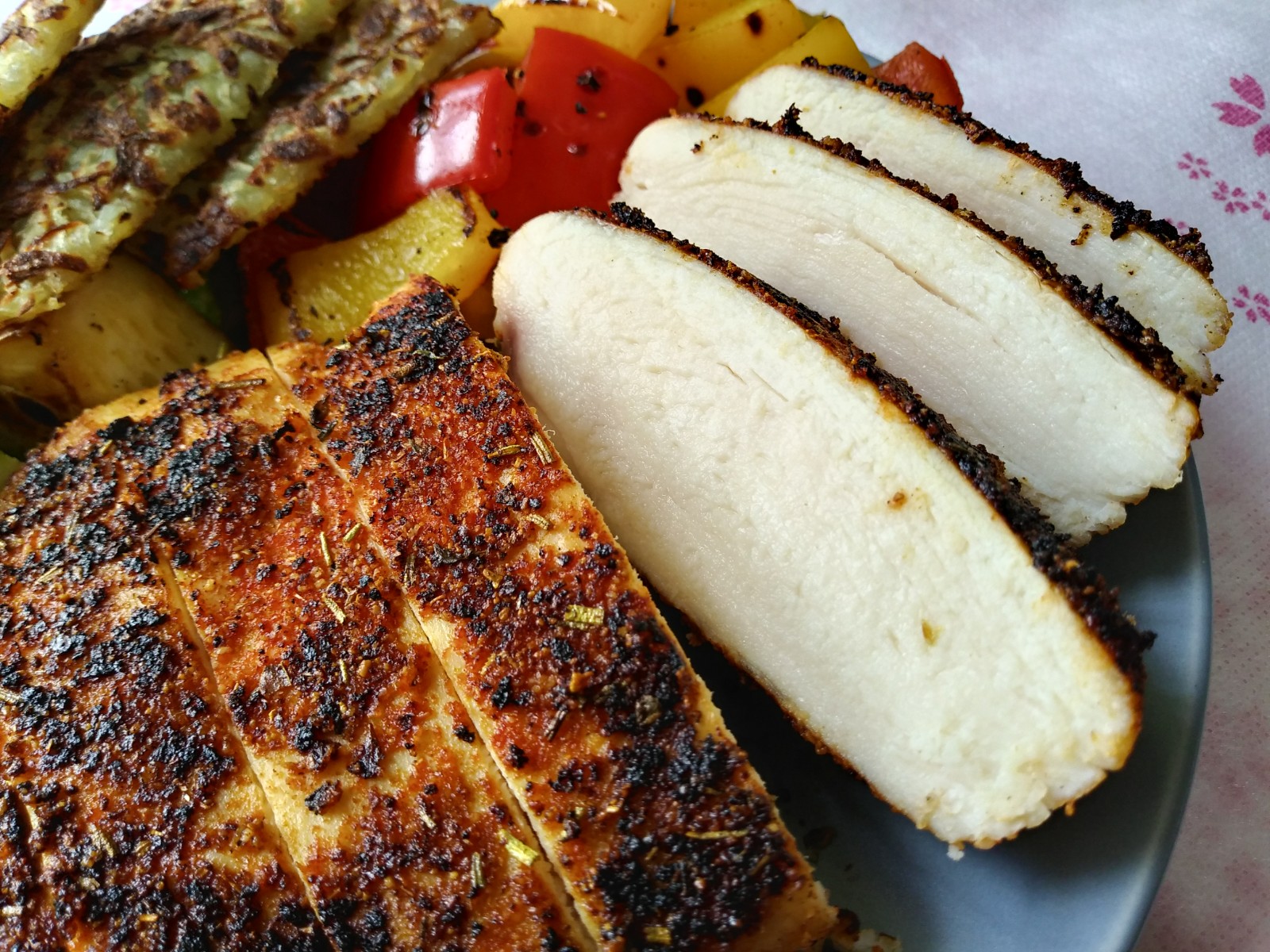 Spicy grilled chicken breast with pan grilled zucchini & bell peppers, and potato rosti