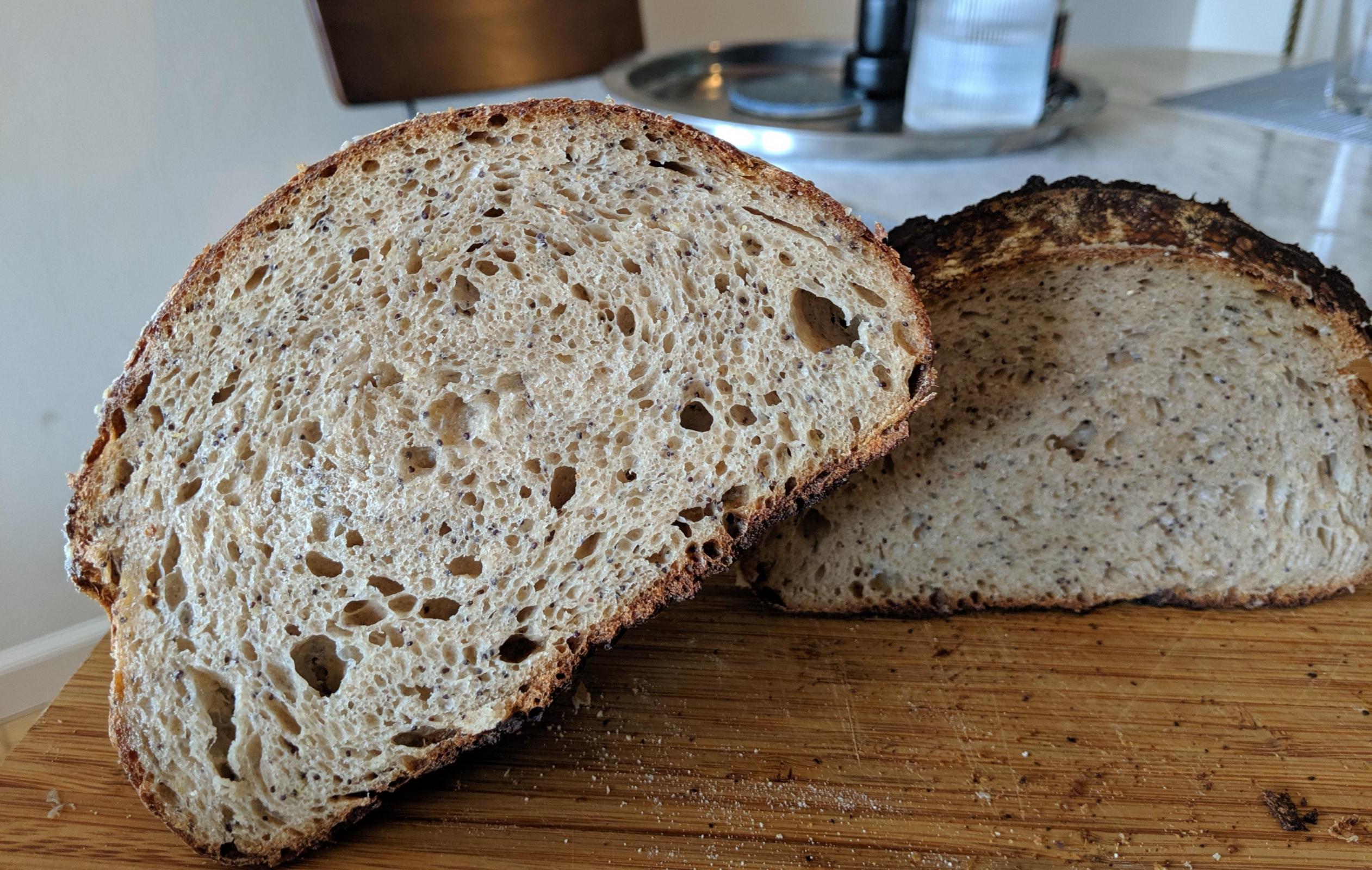 I was inspired by Janet Cook's gorgeous bake back in 2013 and decided to give it a go. I used my Farmer Ground Flour high-extraction bread flour. The hydration of this loaf is 80%. They smell absolutely amazing! I didn't pre-soak the poppy seeds so the dough felt pretty dry for 80% hydration and I might increase the water slightly next time. I think the crumb is decent for 100% T85.