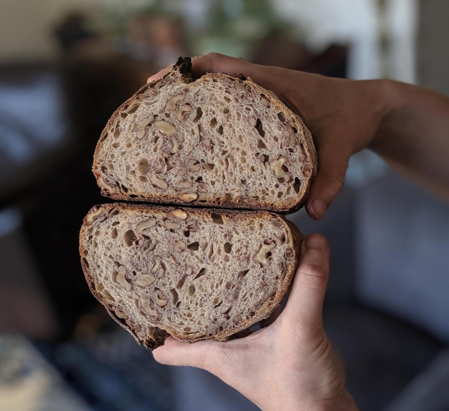 Definitely not my most attractive bread! This bread was 85% hydration, with 35% T85, 10% rye (never done this before), and 55% bread flour. I added 150g of toasted chopped walnuts which was a lot for my 750g of dough to handle. I did a 12% starter inoculation, but also added 50g of yeast water to the dough. I'm not sure if adding the yeast water really made a difference or not.