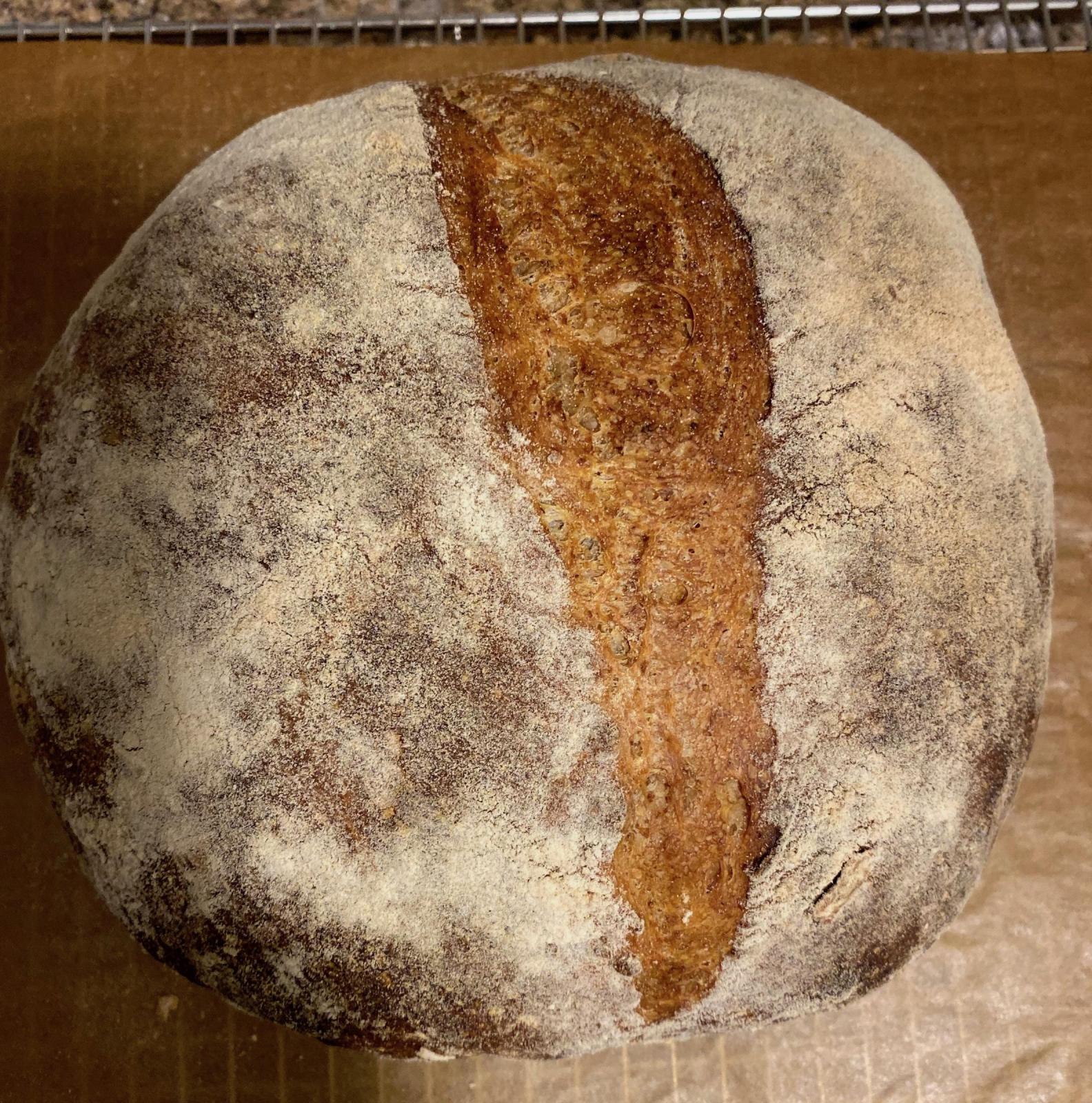 It's a 1000g boule; I used about 210g of pre-ferment (10g starter, 100 rye flour, 100 water), with three folds every 30 minutes. Bulk fermentation was about 2 hours, pre-shape and rest, then shaped and proved for about an hour. I did the bulk fermentation somewhere near 82-84 F with a heating pad, and the proofing was around 70-72 F, the ambient temp in my kitchen. I preheated my electric oven at 500 (max it can go) with a baking steel, and once I loaded the bread and introduced some steam, dropped the temp to 450 for 30 minutes, than 375 for another 20.