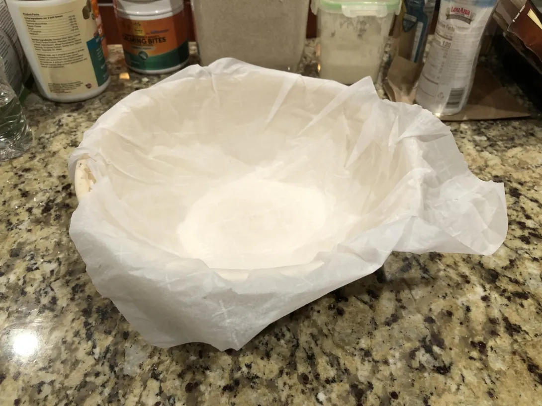 2. When I use a banneton for proofing, I typically line it with parchment paper instead of flour. Cut a square of adequate size first, To make it easy to form and not pop up our of the basket, I wet it with water first in the kitchen sink for a few moments. Then press the soft paper into the basket and form it, making the necessary folds and creases. It will hold its shape. Let it dry for 30-45 minutes and it's ready to go. After it's dry, it can actually be removed from the basket and it will hold its shape like thin shell.