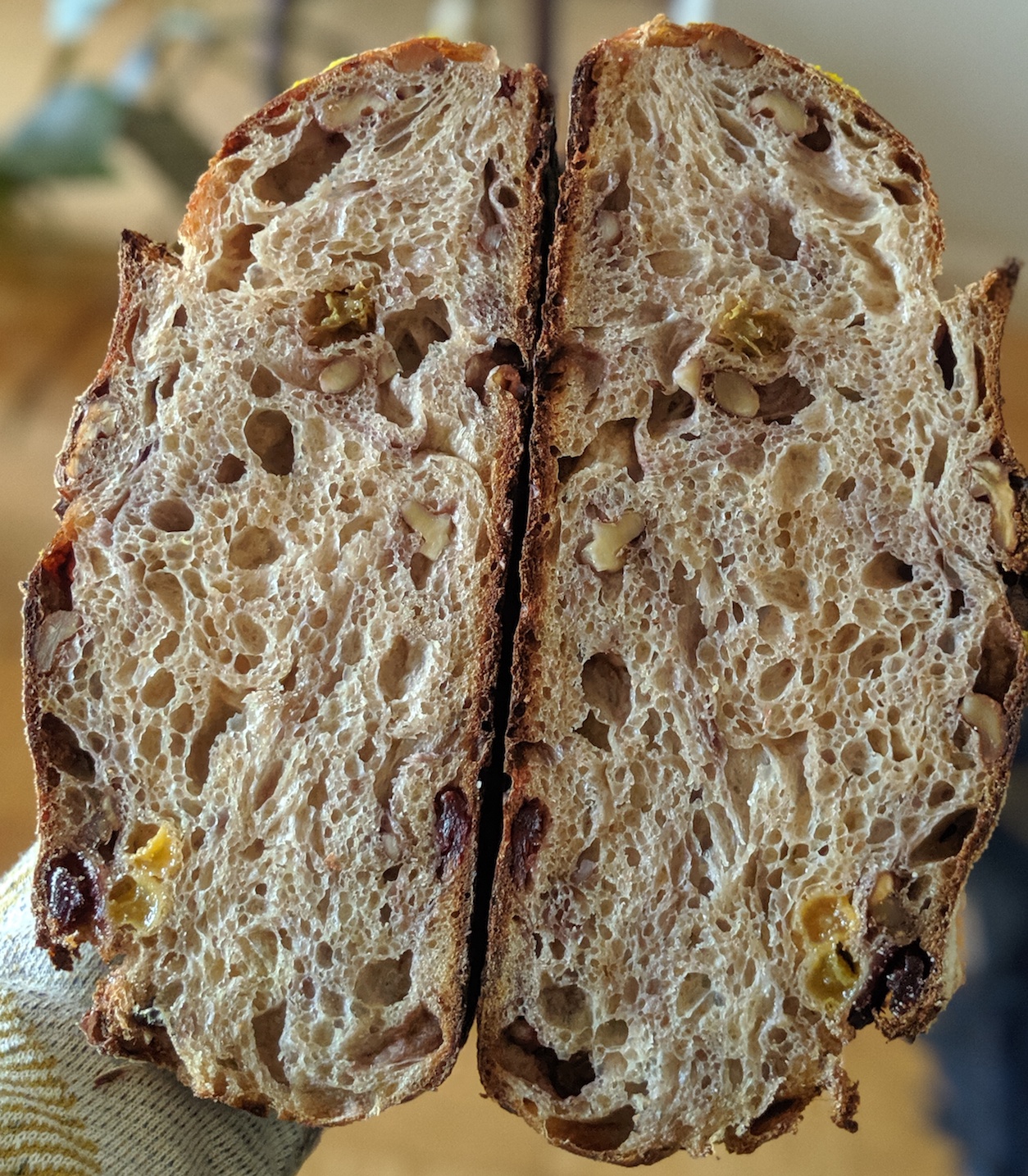 The crumb looks really good especially considering the fruit, nuts and high percentage of whole grains. I’d say you got the fermentation right Ilene.