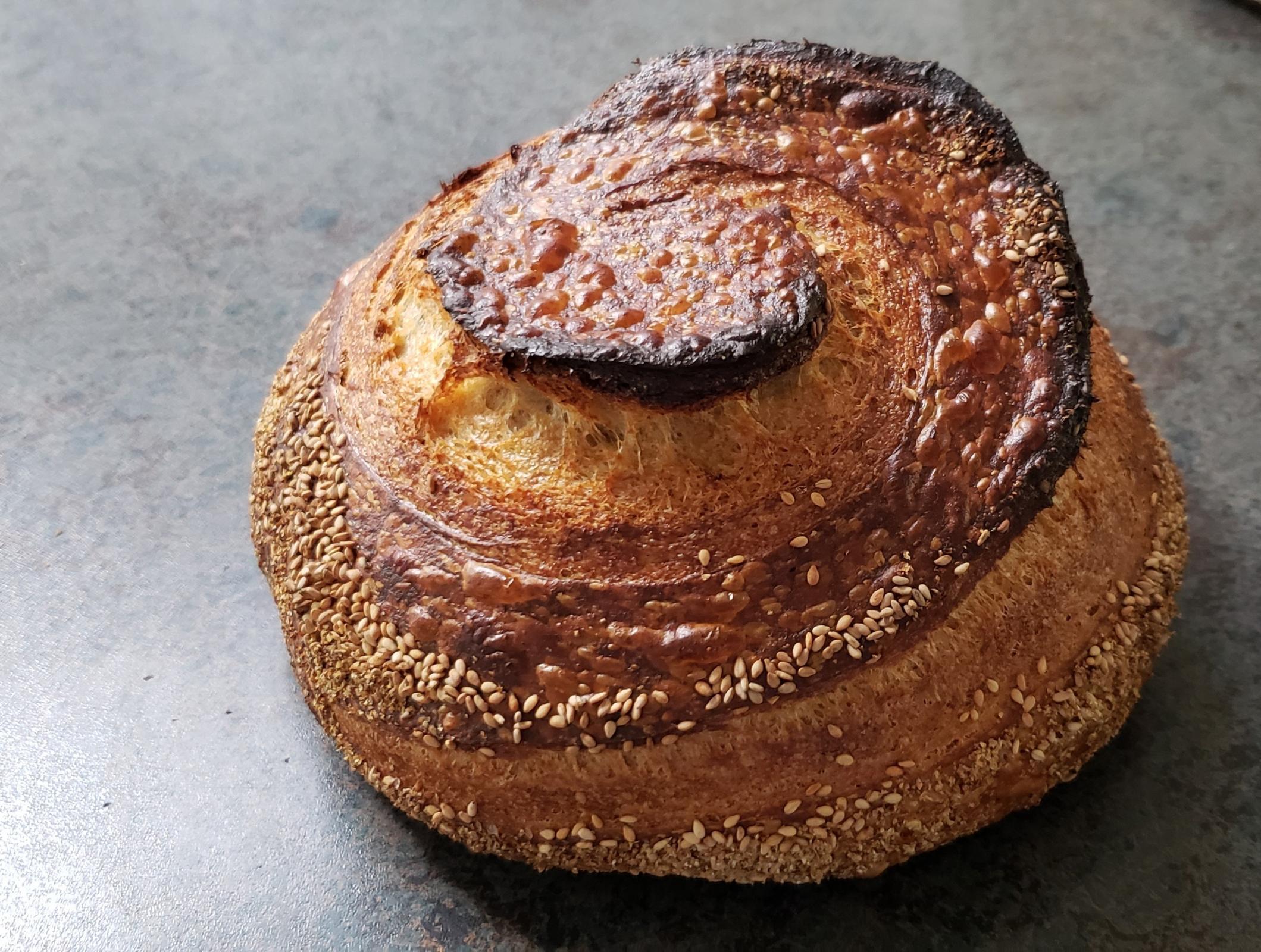 My first bake with this year's organic grain harvest CSA share from Cedar Isle Farm - an Oat Rye Sourdough - sprouted oats and rye, rolled oats/cracked flax soaker, sifted bran and sesame seed coating.