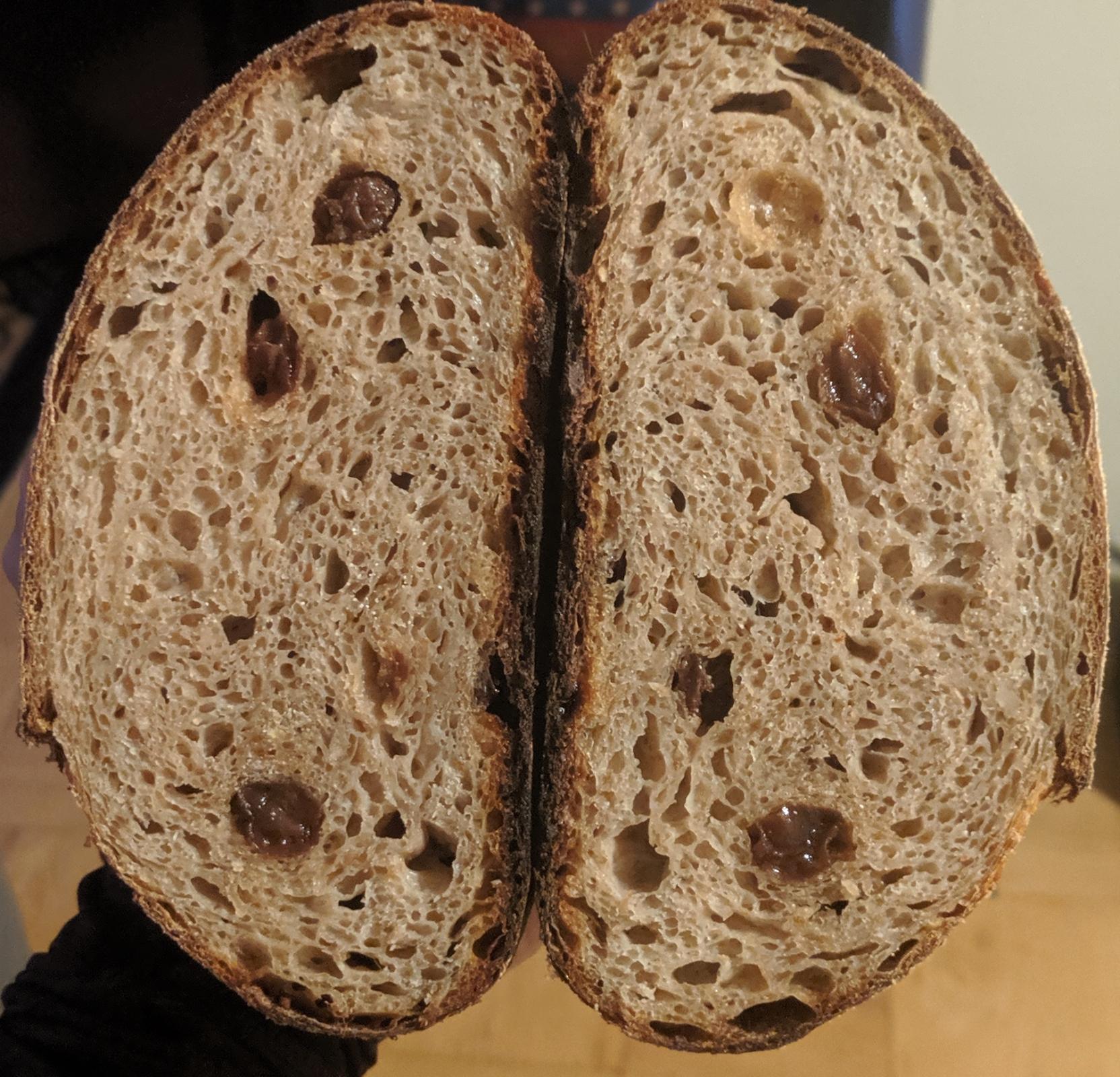 This bread was a real experiment! I had some apples from the farmer's market that I wanted to use, hard apple cider, and apple YW. I had also wanted to make another bread using oat porridge so I decided to do it all taking inspiration from the idea of apple/raisin oatmeal. This bread uses 5 different flours, oat porridge, sourdough levain, YW levain, raisins, hard cider, and grated apple. I kept the hydration at 55% because I was worried that the dough would turn to soup with all of the liquid from the oats and apple. The oats were not cooked, but were soaked overnight in the hard cider. The bread is about 40% whole grain.