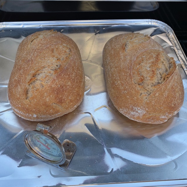 Removed dough from bannetons, placed on large disposable aluminium sheet, slashed & spritzed both loaves and placed on the rack. Closed the hood, set the timer then remembered I hadn't covered the loaves. Opened hood, covered loaves with the 2 inverted DOs and baked for 12 minutes. On removing DOs I was disappointed with oven spring but carried on. Thermometer was reading fairly steadily 200 deg and my portable one had dropped to about 170 deg C. I set timer for 18 minutes and watched. the dough slowly puffed up more so in the end I am pretty happy with the amount of oven spring. I felt dough wasn't quite baked at this point and Dough didn't brown very fast so I baked for an extra 15 minutes. It has turned a light golden brown. Internal temperature was 208 deg F