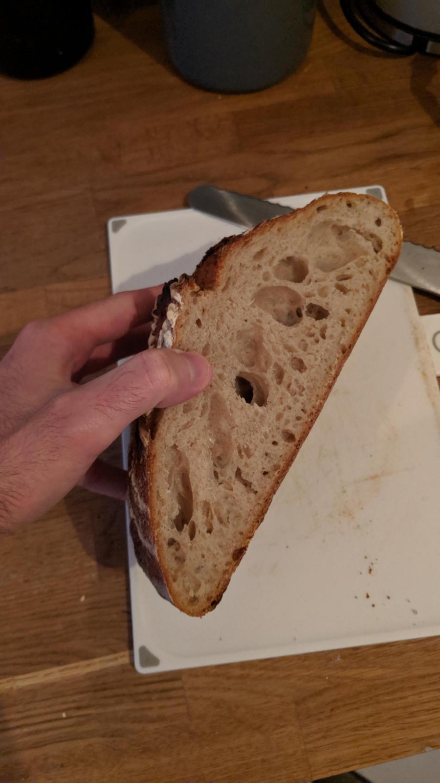 What a disaster, even worse than before. The dough barely jumped in the oven and the crumb had huge dense bits with a few cevernous holes (see pic). I'm going to try and work bottled water into the starter and see if it makes a difference-