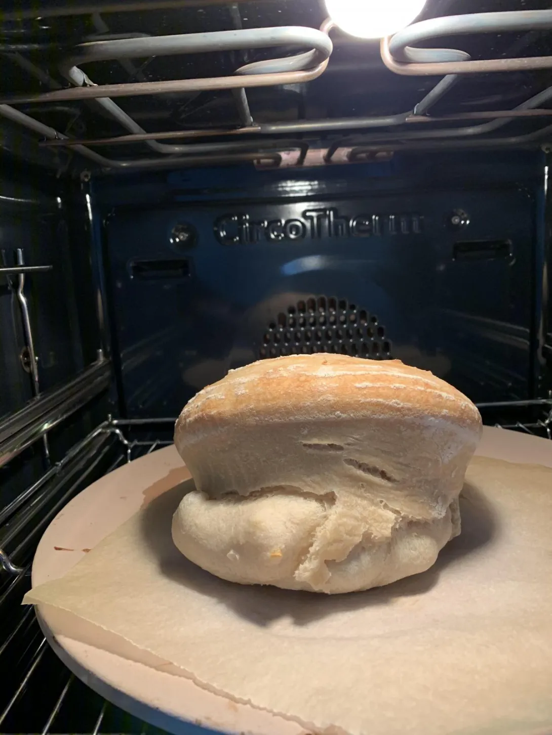 Unfortunately I didn’t take a photo of the hidden side. However, I remember turning the bread about 90 degrees when I noticed the eruption in the oven.