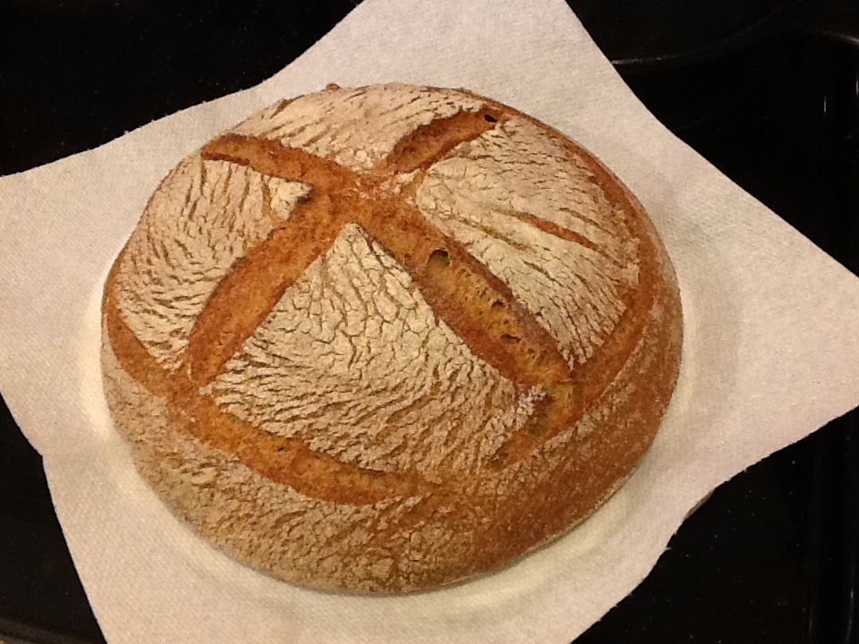 Looks good! Nice oven spring along all score lines, both around perimeter, and the X on top.