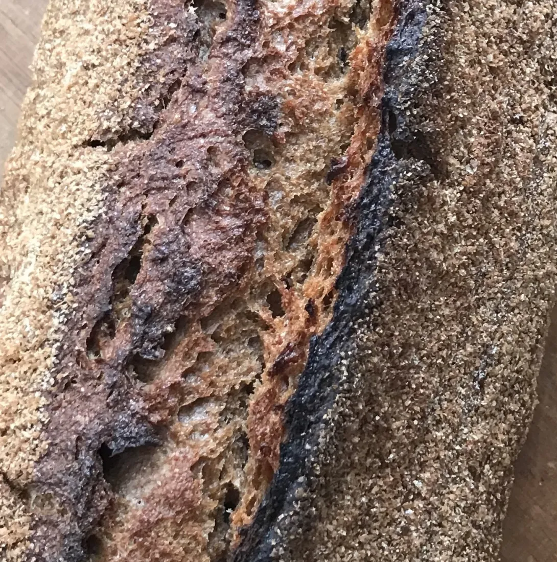 Just pulled this beauty out of the oven about an hour ago. Loaf is half hard red winter wheat, half blue-tinge emmer, 68% hydration, and made with a 100% hydration WW starter. I haven't yet cut into it. But I'm loving the colors in the score. I sifted out about 2/3 of the bran, using it to line the banneton. The very edge of the ear is slightly burnt, but the crust is lovely, and as I said, I'm loving the colors in this score.