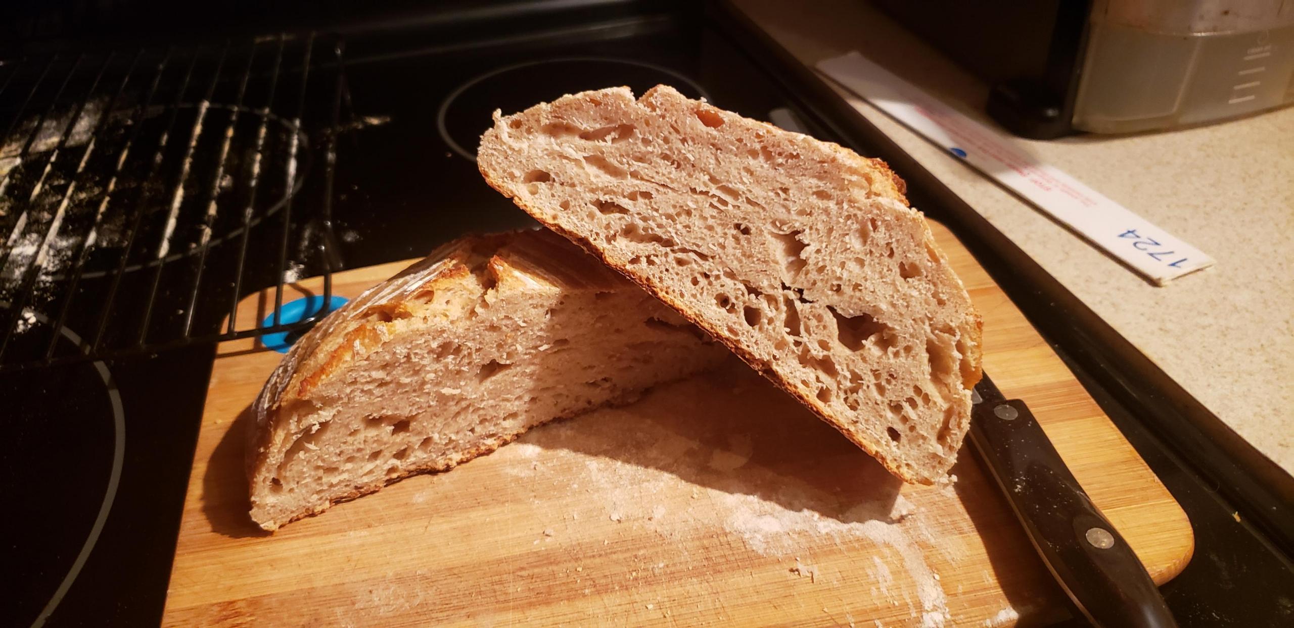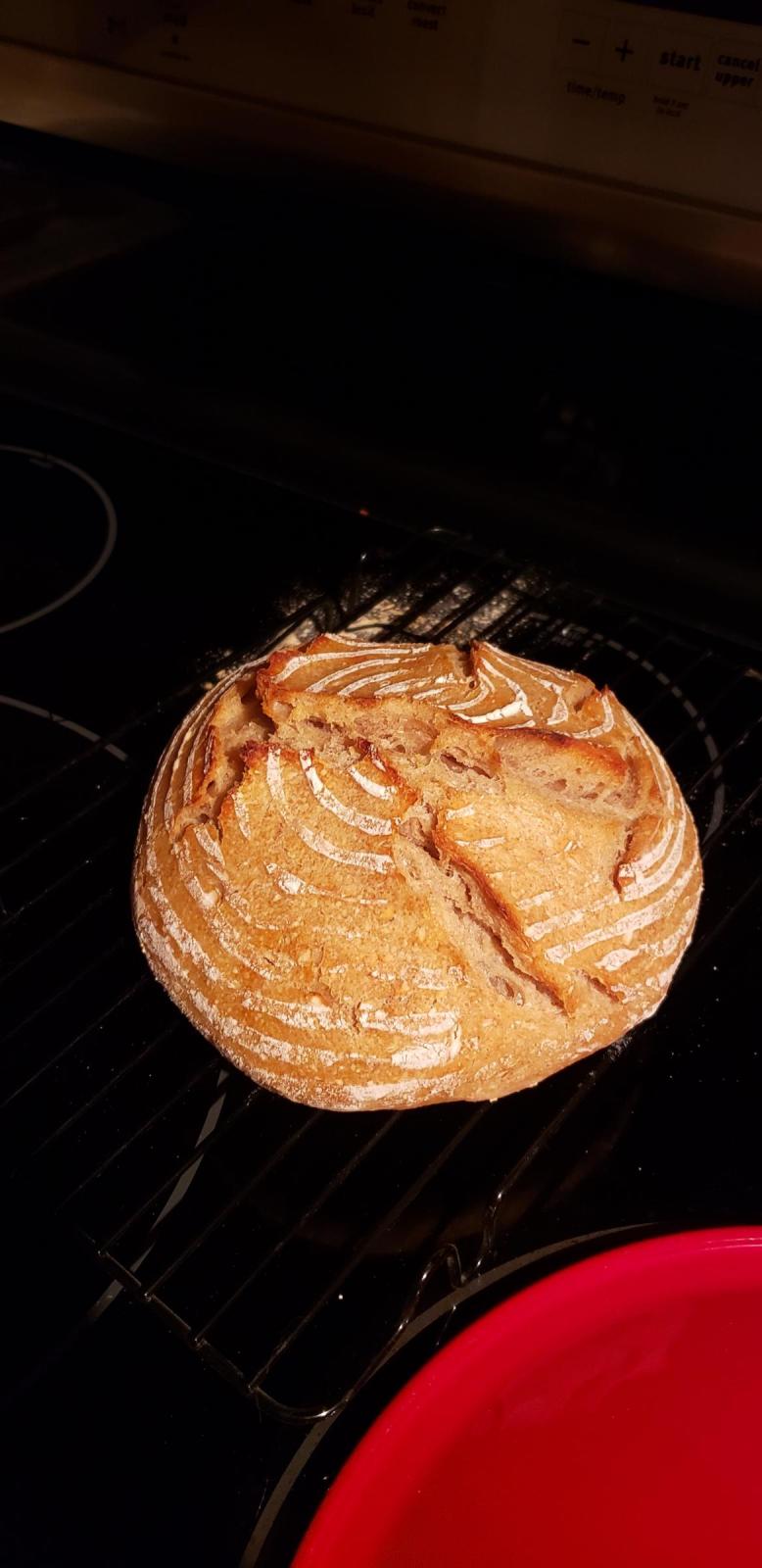 I made the starter in September and never had enough time after that to learn how to make bread, so I figured over the holidays would be best. This is the first loaf that made it to the oven (it was very relieving to see the oven spring when I took the lid off).