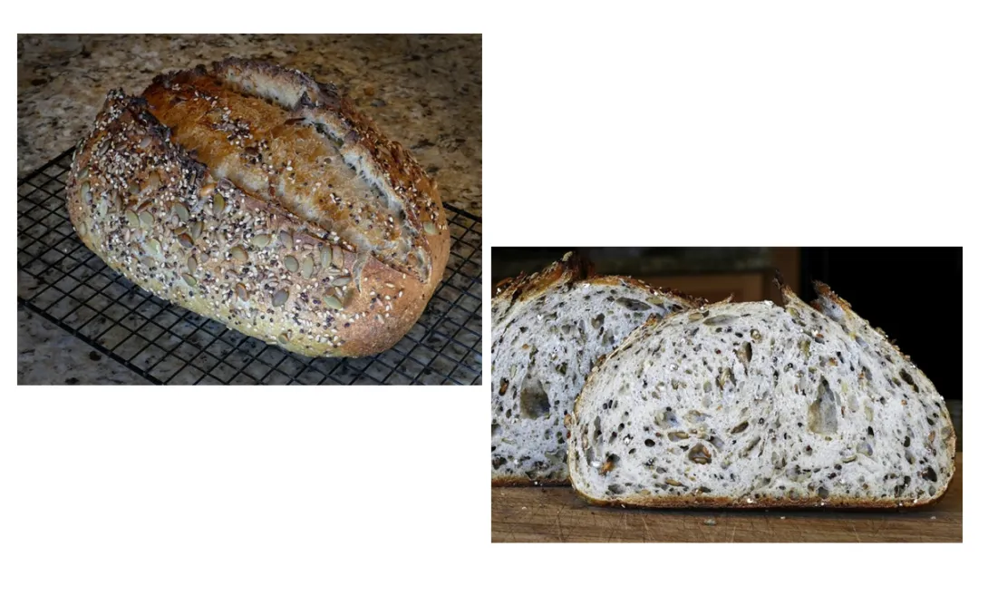 Inspired by recent post (AKSourdough) re Hammelman's "Vermont Sourdough Rye" thought I'd try my hand at a multi-grain variety. Baked a large 1300g loaf using an aluminum dutch-oven. Result measured 11" x 6" with a 4-1/2" rise. Good crust, good crumb, great eating!