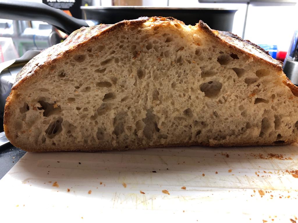 This produces bread that tastes great but has that slightly gummy and moist touch to it. I also see that it has a much more open crumb  towards the bottom and outside of the loaf - which I confirmed in the end by slicing a boule in half horizontally and seeing a more open crumb on the outside. Below a re a couple of vertical photos showing a more open crumb away from the centre and a more dense one towards the middle: