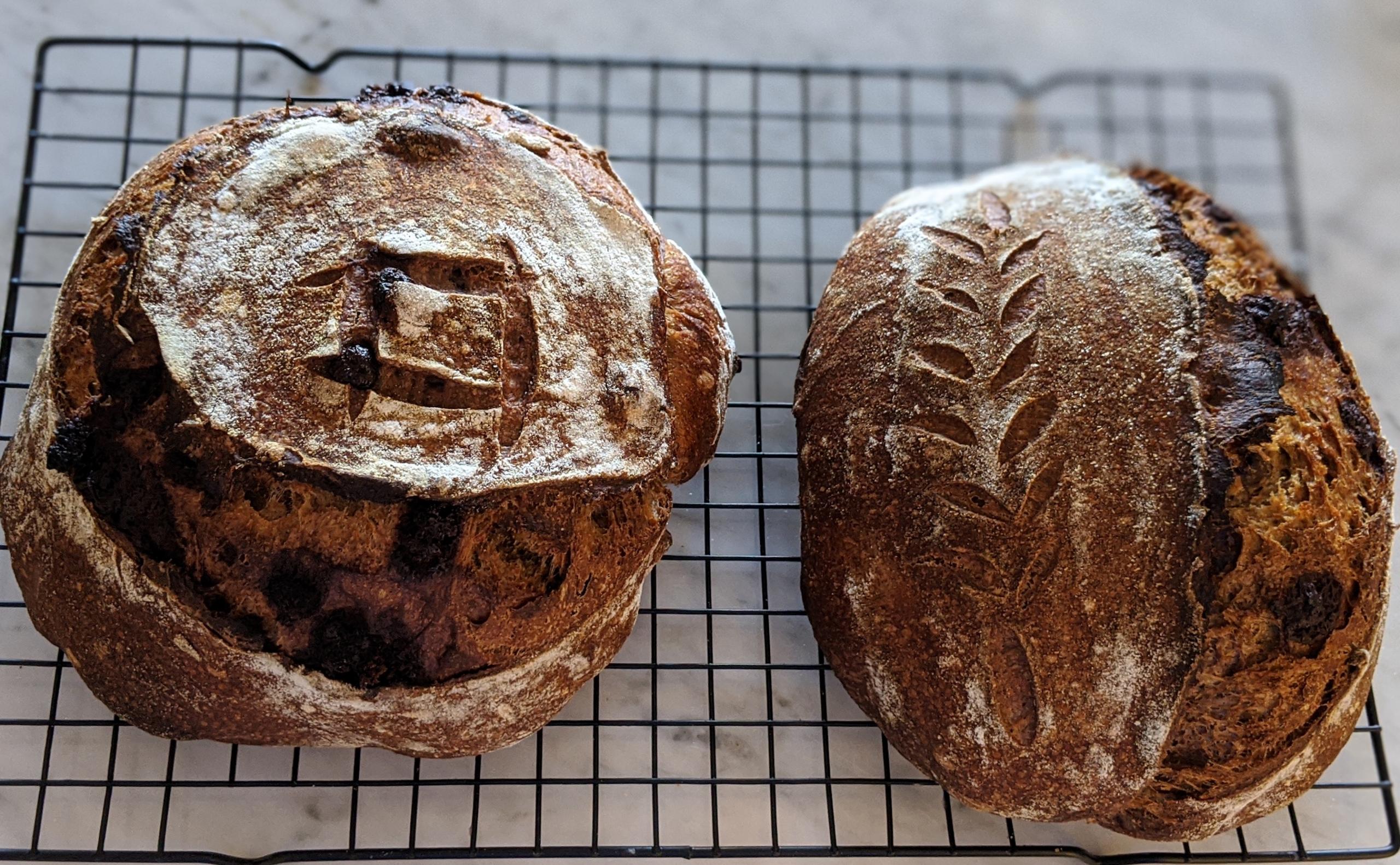 I had some bananas sitting around and was inspired by a banana sourdough post from Trailrunner. I'd also been itching to make another chocolate sourdough, so I decided to make the two doughs and laminate the two together. I found it pretty hard to develop the gluten in the banana dough (which uses almost no water and just bananas for hydration), so I won't be surprised if this is a dense loaf. One loaf looks quite pretty from the outside, the other is a lovable mutant with bumps and lumps.