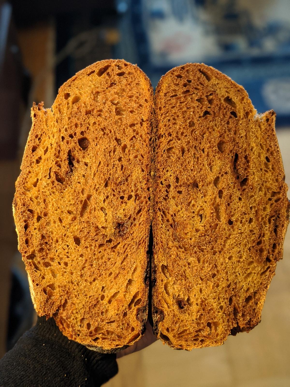 The crumb is a bit dense, but I think it's okay given that the dough is 40% banana + the cocoa powder. The taste exceeds my expectations! Next time I would try and use a darker cocoa powder so that the lamination is more visible.