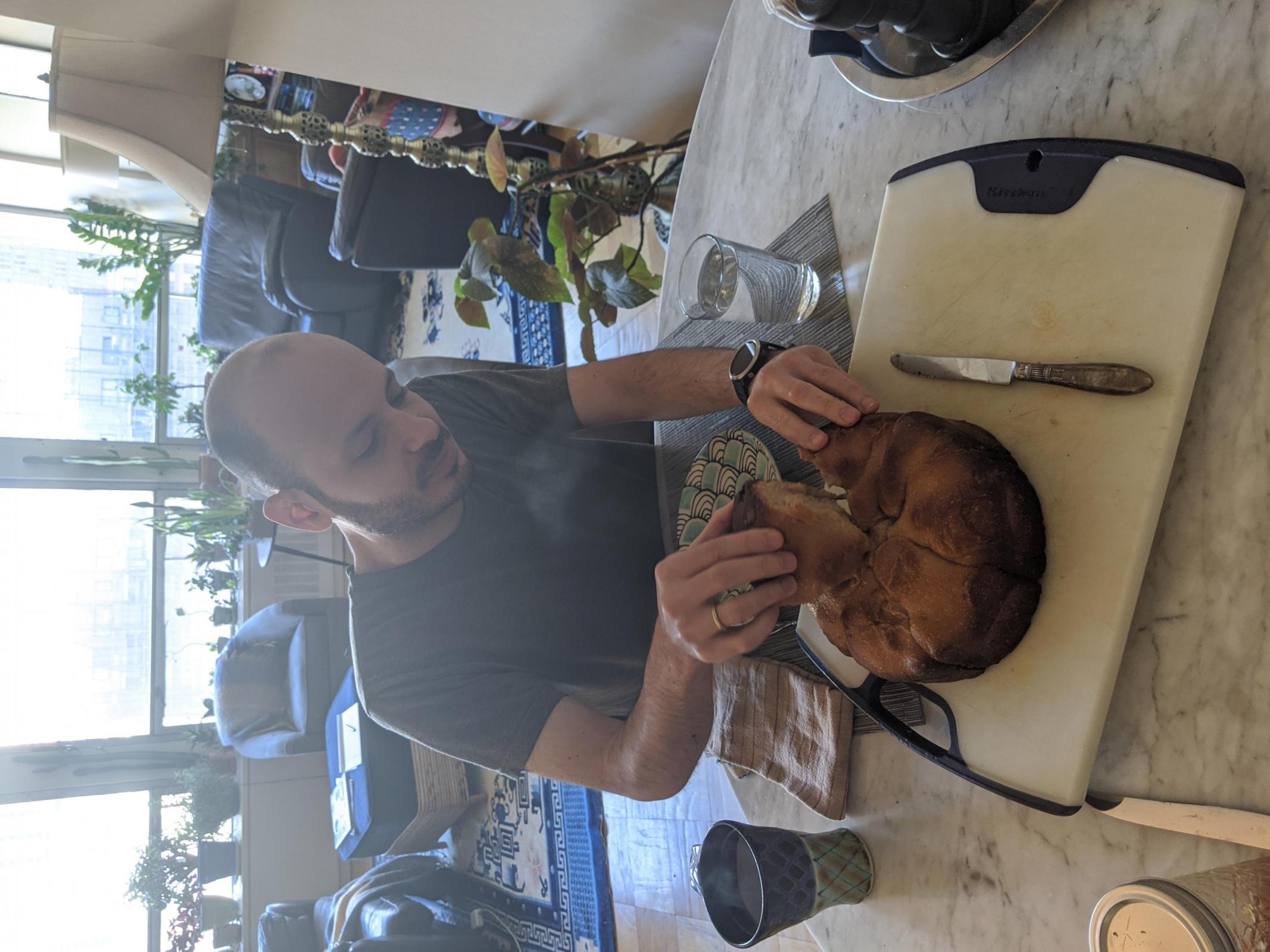 My husband requested a recipe I'd made a few years back (before I got into sourdough) of kubaneh from the cookbook Golden. Since I now know a bit more about bread, I decided to make some slight changes. I didn't have time to convert to sourdough, but I did add 10% sourdough starter and added some whole wheat. It was even better than I remembered! Next time I'll convert the recipe to sourdough. This bread is baked in an 8-inch deep cake tin covered in tinfoil and the outside gets beautifully dark and caramelized. The burnt bits are the best part. Yum!