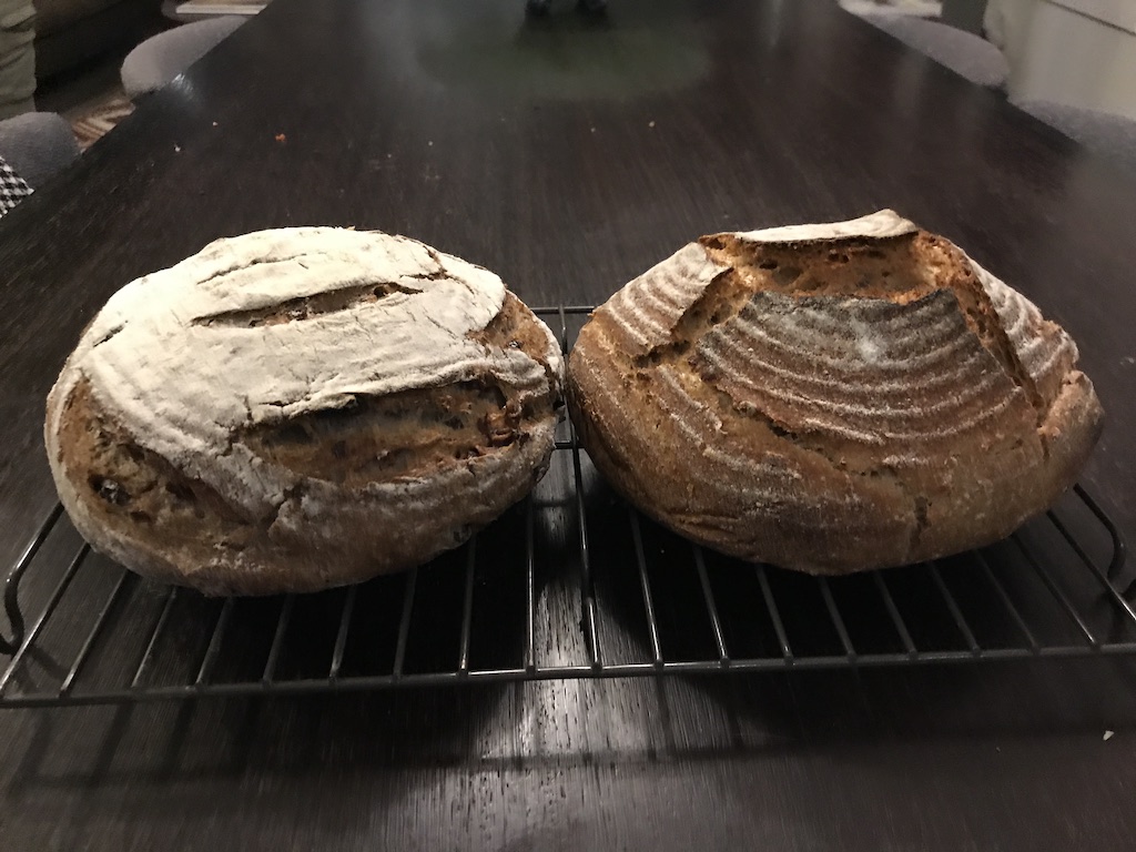 The loaf on the left is a cranberry walnut recipe I adapted from a Hazelnut Fig recipe from Hamelman's Bread and the right is the whole wheat (70% WW, 30% white, 82% hydration, 100% hydration levain - levain amount was 12% of the total yield (flour_water).  I keep detailed notes of every bake so I can refer to good bakes and the odd disaster. For instance this bake I baked two rounds and two batards.  I left the batards in a warmer part of the kitchen and they rose too much so they were too large to handle easily and I dropped one on the baking tiles when putting it in - it will now be used for bread pudding or bread crumbs.