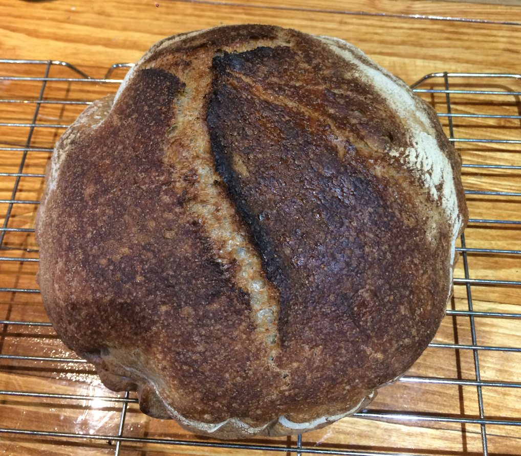 Baked in dutch oven at ~230c for 20 mins covered, 30 mins uncovered. Let cool for 1 hour.