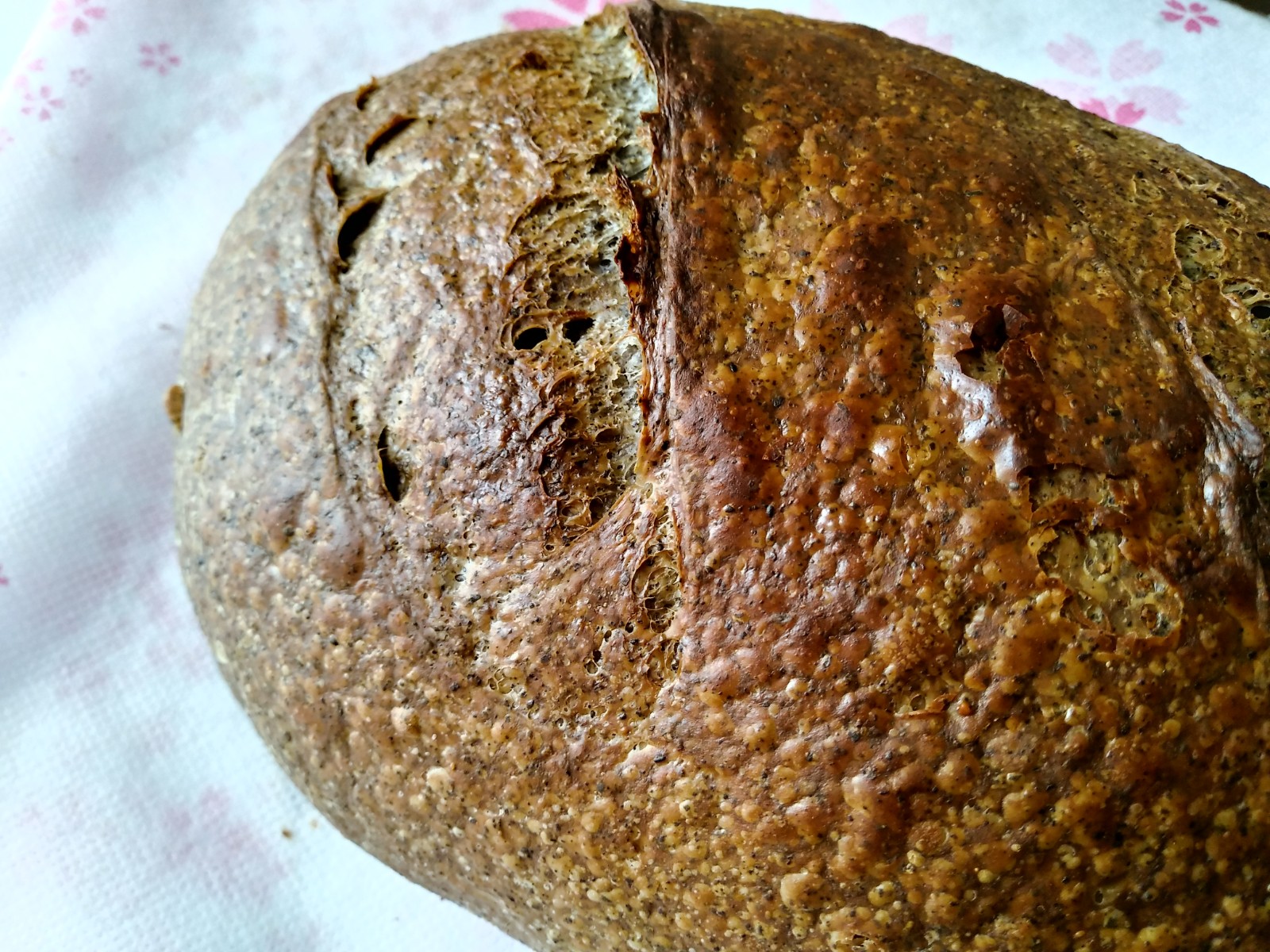 Remove the dough from the fridge 1 hour before baking. Preheat the oven at 250°C/482°F. Score and spritz the dough. Bake at 250°C/482°F with steam for 20 minutes then without steam for 25 minutes more or until the internal temperature reaches a minimum of 208°F. Let it cool for a minimum of 2 hours before slicing.