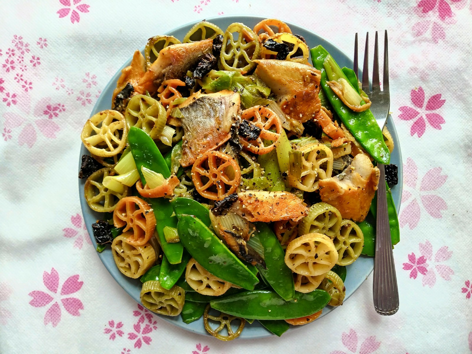 Garlicky rotelle with kipper, snow peas & sun-dried tomatoes