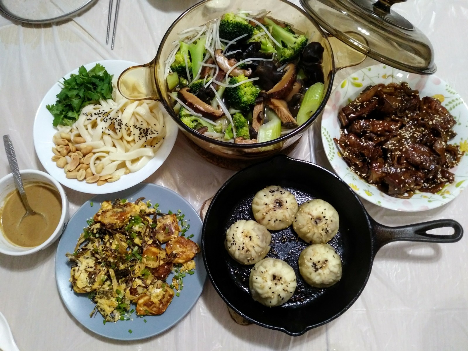 Sheng jian carrot pork bao, pan-fried mochi with eggs & pickled mustard greens, Homemade noodles with a sweet & sour sesame sauce, pressure cooked Zhengjiang style ribs (yes, those aren't charcoal...), and mixed vegetables in broth