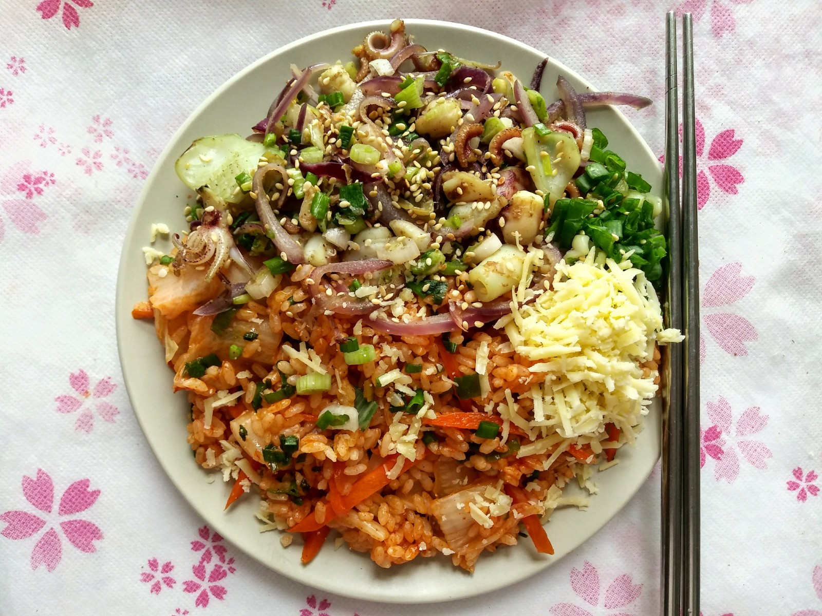 Korean-style mixed rice with fermented napa cabbage & cheddar, and sesame oil stir fried seafood & onion