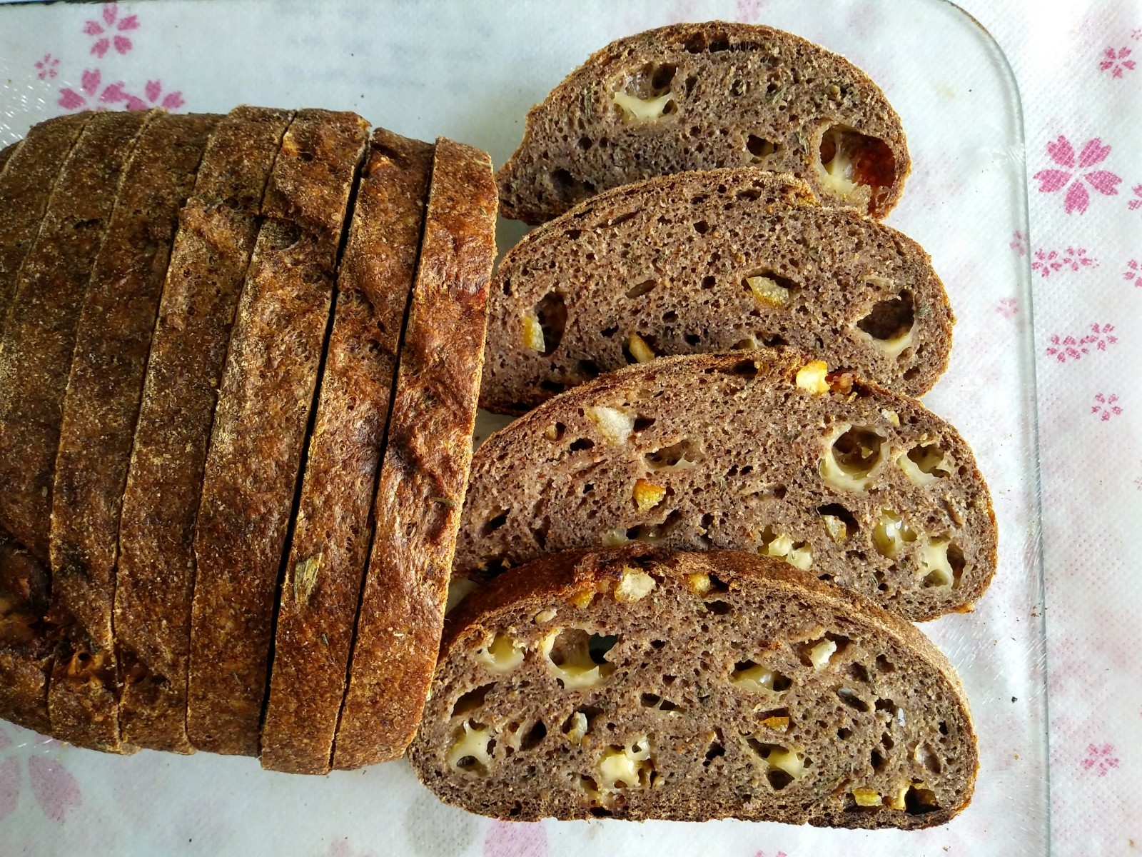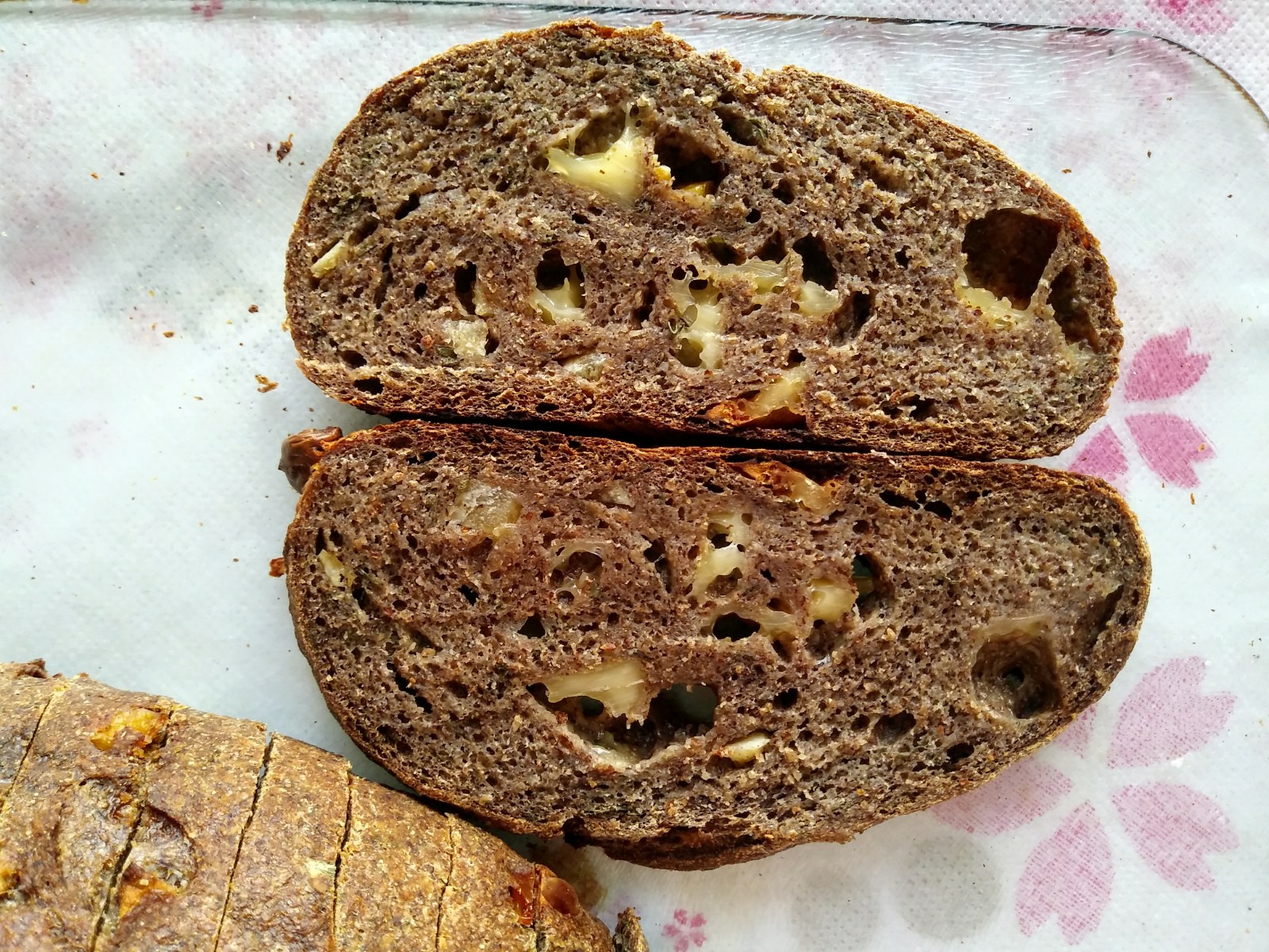 As you can see from the crumb, the bread was not proofed to the optimal level. It was a bit tough to judge the degree of fermentation with so many add-ins. Thankfully the melty cheese pockets create an illusion of holey bread :)