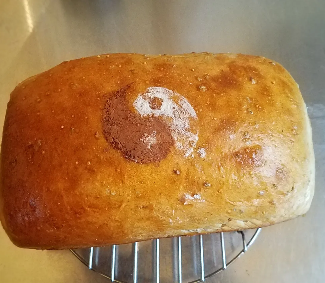 It's mostly ka bread flour, with 10% starter, flaxseeds, butter, 1 tbl sugar, salt.I placed yin-yang on top. Log in or register to post comments