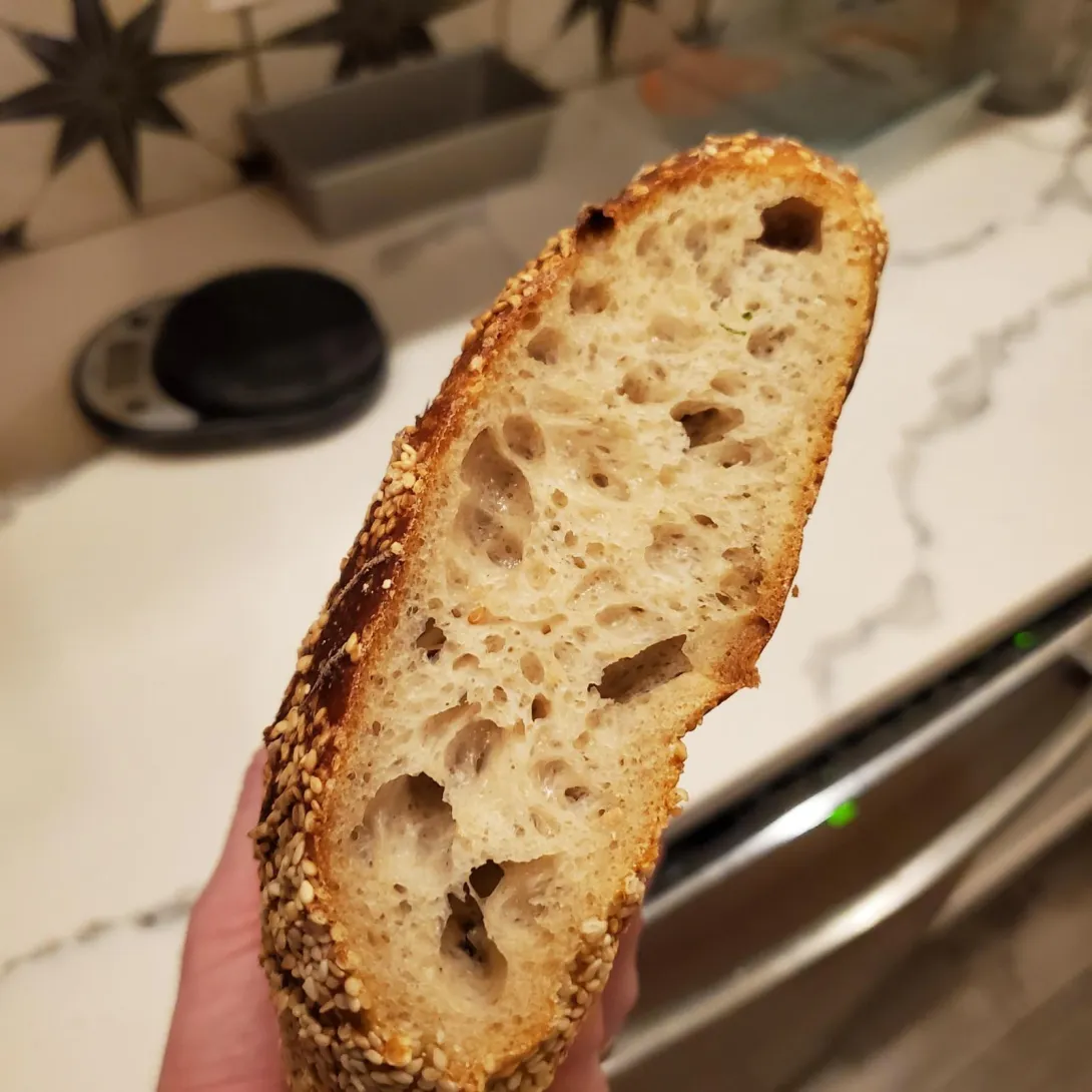 When I got home, I was pleased to find that the dough looked healthy, slightly domed, and bubbly. However, when I tried to do a final coil fold to release it from the proofing container, the dough was cemented to the sides and bottom. I ended up using an oiled rubber spatula to release it onto a floured counter top. It was impossible to shape because it was so sticky --gluing itself to anything not liberally coated in flour. This was especially straUltimately, the loaf ended up an inedible pancake after I barely coaxed it into a banneton, but the crumb was rather nice. I'm really bummed I forgot the salt, because it smelled amazing and even tasted pretty good with some sprinkled on.