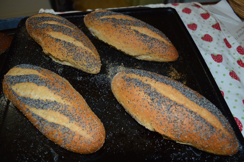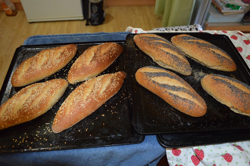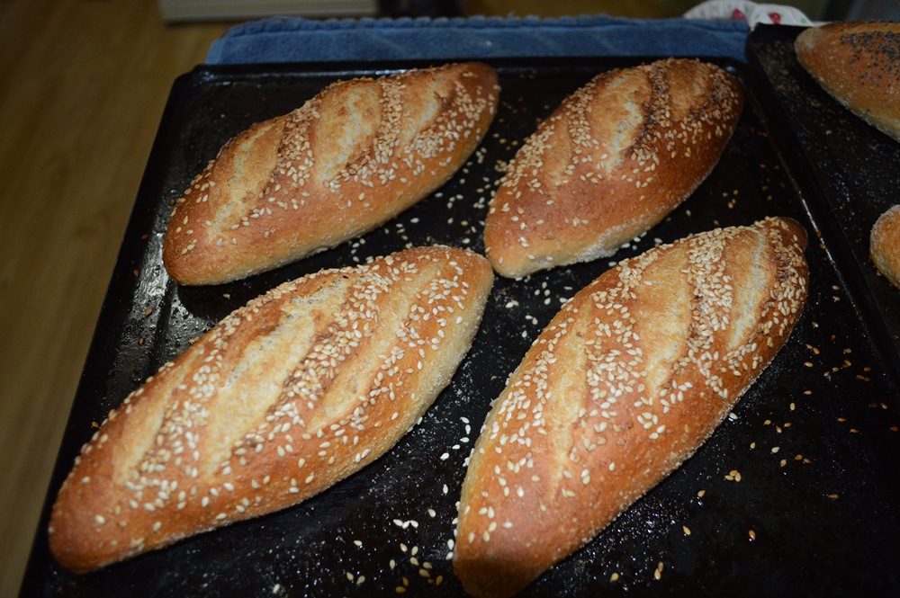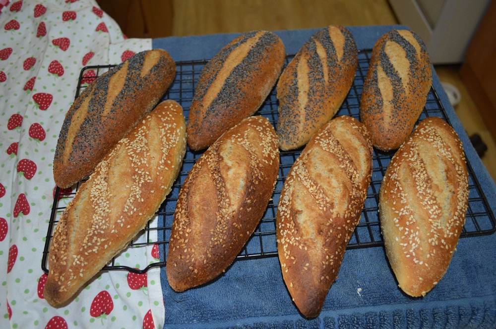 This dough was made using some sour dough starter straight from the fridge mixed with the wholemeal flour and all the water and allowed to stand overnight in the morning the rest of the flour salt malt olive oil salt and dried yeast were added and mixed by hand on the bench. It had a 2 hour bulk fermentation period was taken bench rested and then shaped. The dough pieces were weighed off at 160g each, unfortunately i wasn't able to find my fluted baking sheet so placed the dough pieces onto a couch to proof . From there the loaves were then transferred onto two flat baking sheets washed and seeded and scored and placed into a very hot gas oven with a steam tray on the bottom. This was removed after 10 minutes and the temperature was dialed back and the trays swapped places in the oven, after a further 10 minutes the heat was turned off and the door of the oven was left open for another 5 minutes to get a drier crust.