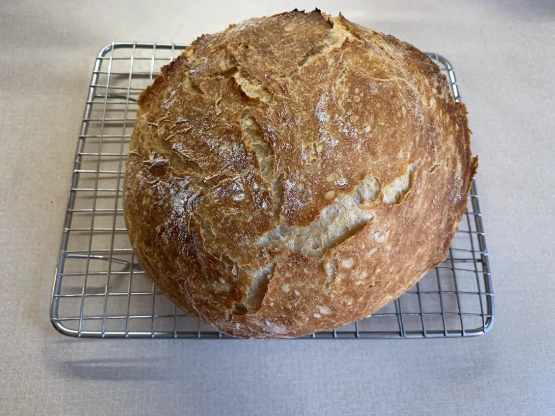 I mixed up the dough, let it rise at room temperature for ~15 hours, shaped it and baked it at 475 F on parchment paper in a stainless steel pot with a lid - 30 minutes with the lid, ~20 minutes without the lid.