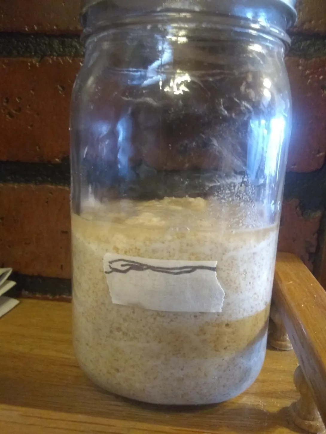 I started my first starter 5 days ago with 1/2 cup hard well water and 1 cup old whole wheat flour. Discarded all but 1/2 cup starter and fed 1 cup old AP flour and 1/2 cup well water every 24 hours for day 2. Got some activity and rise during the first 48 hours. Day 3, went to twice daily feeding of same. This is when rising stopped. I have continued to feed every 12 hours for day 3, 4 & 5. Added some extra water because starter was very thick. No rise, though some bubbles. Day 5, I fed same in am, 12 hours later no rise or bubbles. I fed with whole wheat flour to try to give more yeast at evening feeding. Day 6, 12 hours later (this morning) no rise, no bubbles. See picture. My house is fairly cool (68F) for the most part. During the days of rise, I had a fire in the wood stove, and the house was warmer. I don't have an oven light, and the top of my refrigerator is not very warm, so I keep the starter in the kitchen on an inside wall in a central location.