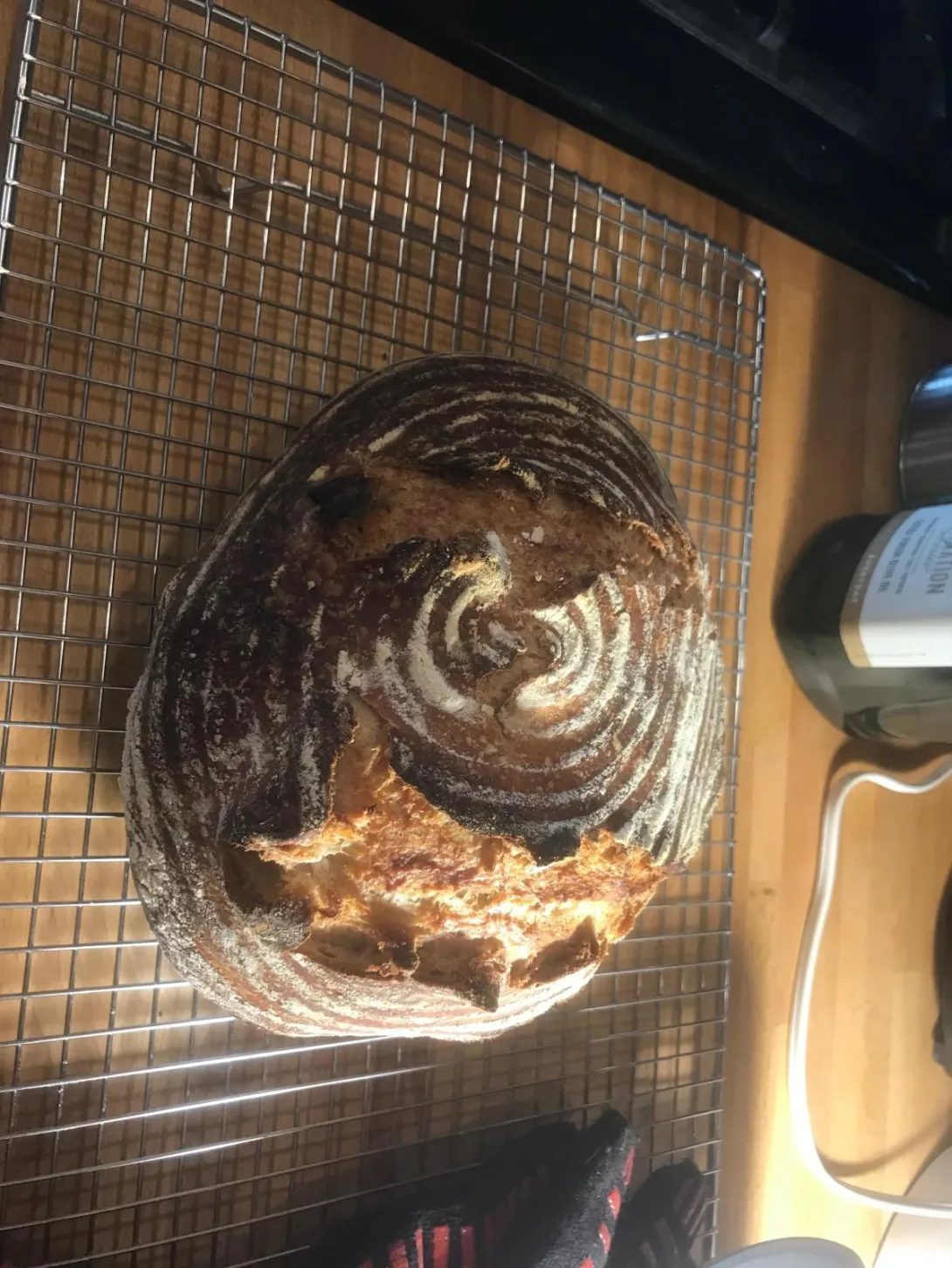 First: for my round sourdough loaves, I use a floured banneton with no liner (the liner seemed to stick to everything, was not good). I'm baking in a very old, heavy cast iron dutch oven -- cover on at 475F for 20mins, cover off at 460F for 25mins. Crumb and texture are good.