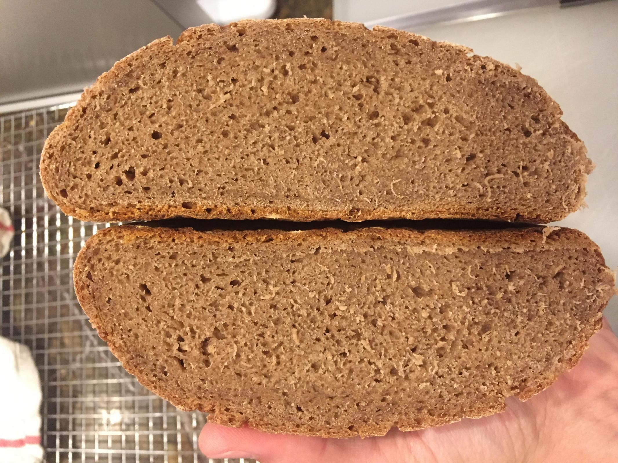 The crumb is fairly dense, but it is a 100% rye bread. I’m quite happy with how it came out, though, for my first attempt at a rye bread. I’m guessing that if I eat better at rye proofing and shaping, it’ll improve. I’m also guessing it may open up a bit more with a somewhat wetter dough.