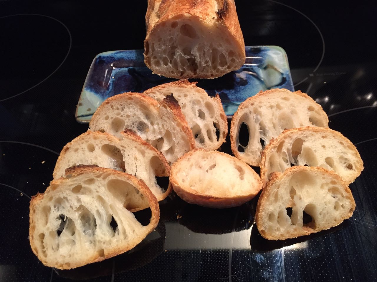A curiosity with these.  The baguette oven spring was quite impressive from loading off the peel initially as flat.  However, the crumb hole pattern suggests that these may have been under proofed.  Following Abel's lead, bulk fermentation was two hours post-mix in my warm, 78-80dF kitchen, and the dough had significant rise.  Then had a total retard time of ~13-14 hours.  Suffcient to come to full proof after being shaped at the 10 hour mark.