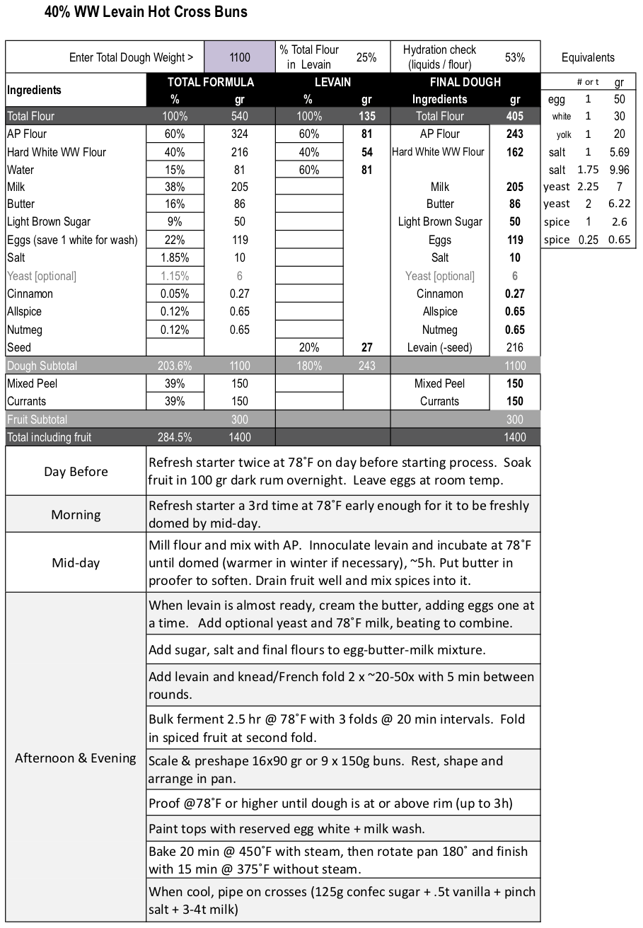 The formula started with King Arthur's CY version and evolved with much input from my Britalian wife for whom these and Colombas are de rigueur for the season, bugger the bloody COVID. I'll leave the Colomba making to Michael Wilson but am happy to share this Hot Cross Bun formula. It might not be sweet enough for American palettes, so if you like your pastries sweet, you might want to bump up the sugar.