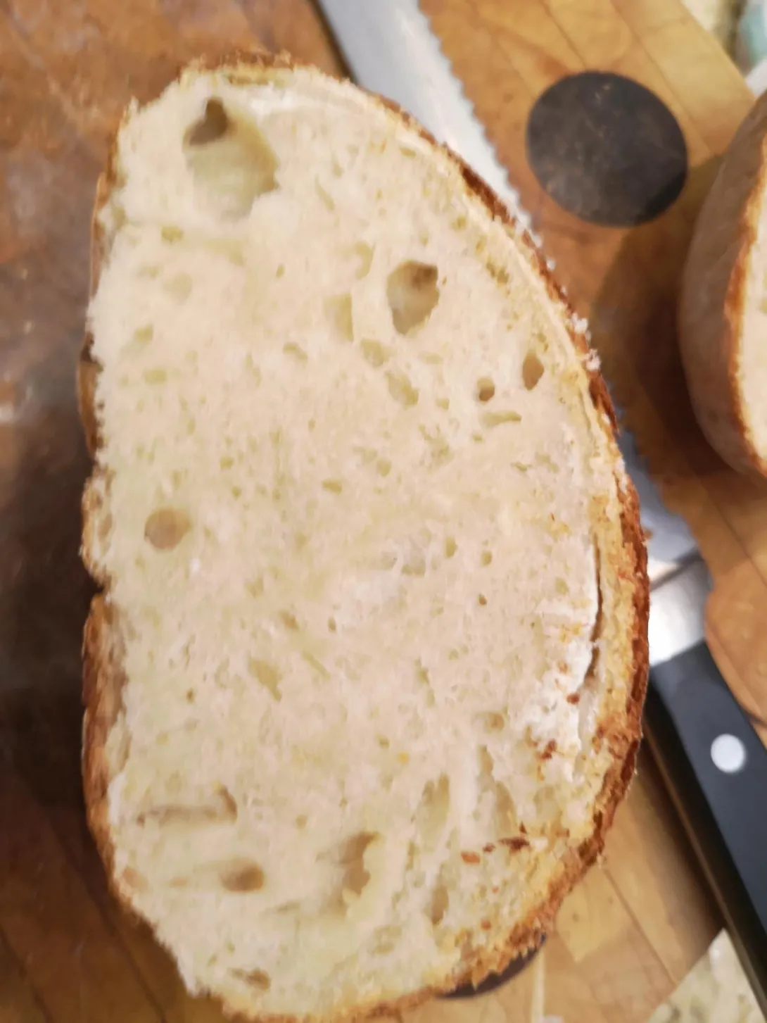 The bread crust is very hard and the inside is dense, stodgy and a little wet, with traces of uncooked flour.