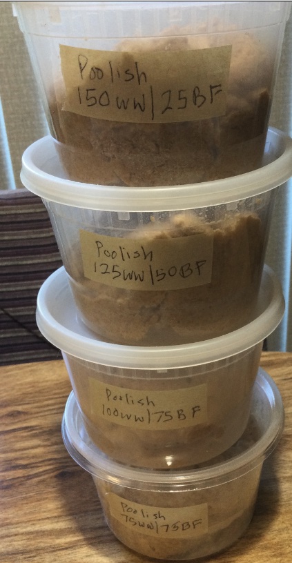My experiments are with 65% of flour in the poolish and am varying the amount of bread flour in the doughs for the non-100% whole grain eaters in the family!