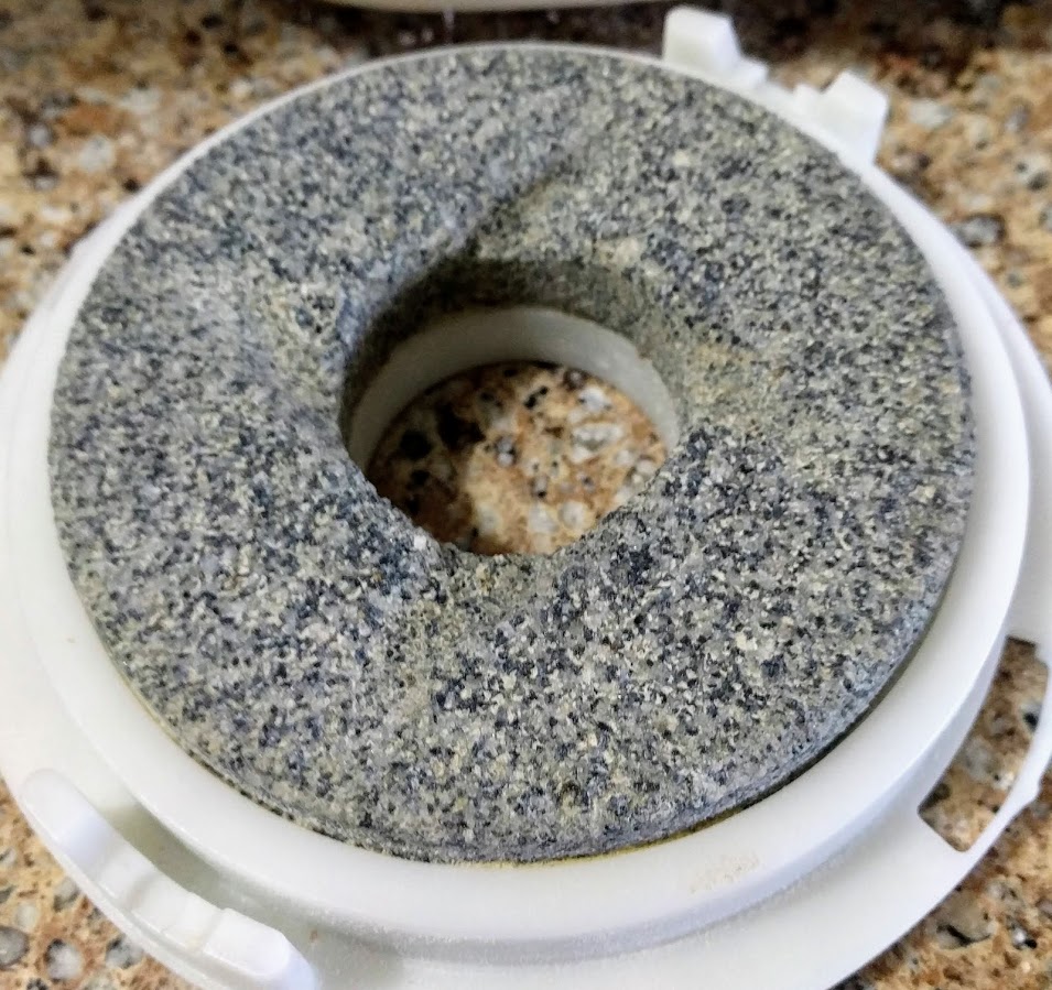 I should have taken a picture of my stones before I cleaned them - they weren't worn at all just had a thick layer of gum on them and I'm sure it is my own fault. It's fairly humid (been raining a lot) so my wheat has surely picked up some moisture - and I have been grinding extremely fine and also regrinding a second time whatever doesn't go thru my sifting mesh. (I'm going to stop doing that). Here are pictures of my stone surfaces (now that I've cleaned them) so you can see how they look after a year of use (light use - I only grind enough for one, small loaf about every other day).