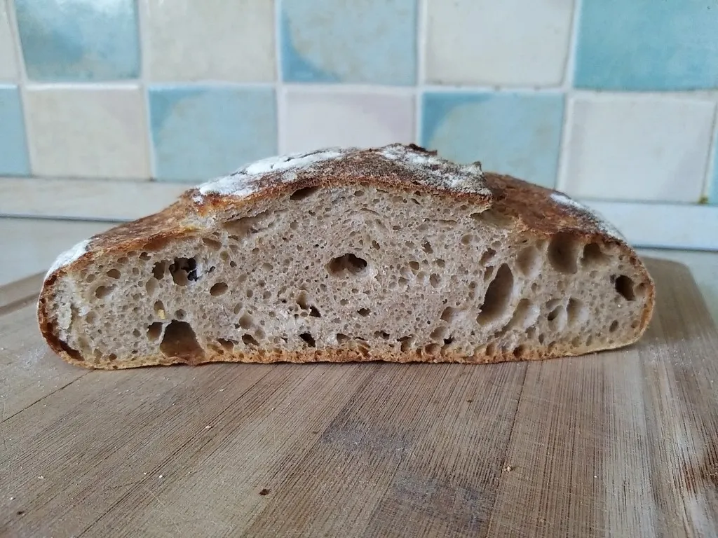 The bread turned out better than the original bake, however reducing the time of soaking worked better. The crumb was tight but light and mostly even. It got maybe too tight only in the middle. Still edible.