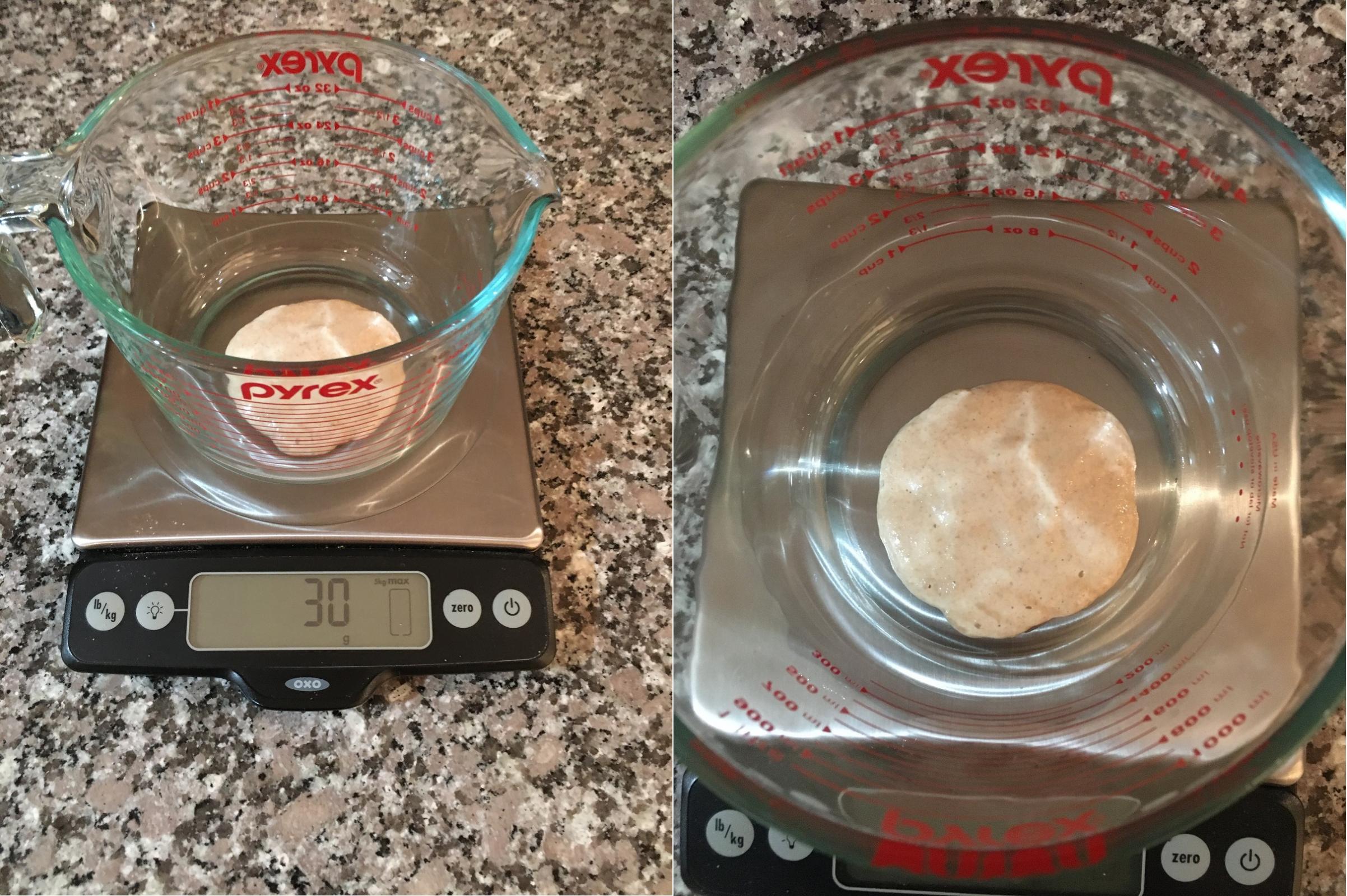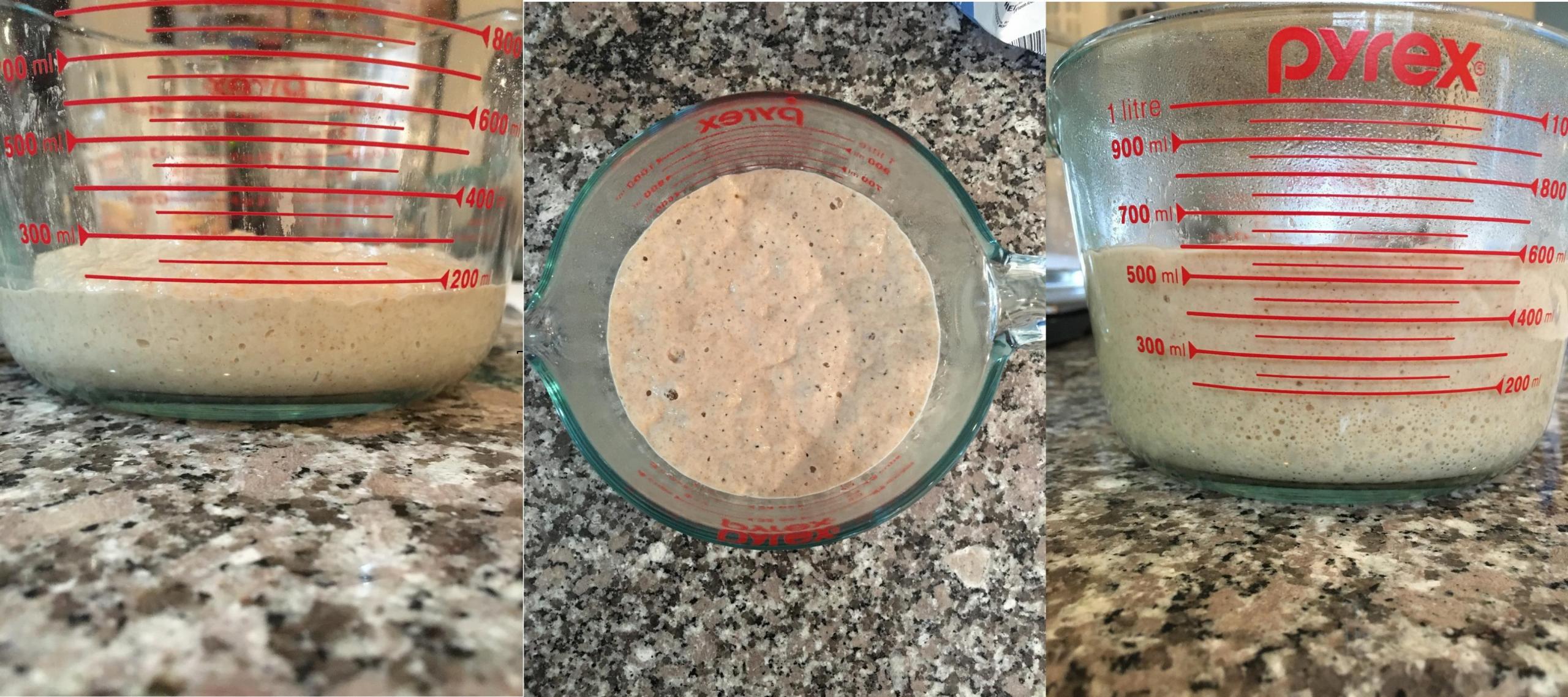 When all mixed together, the levain initially has much less volume than it does the following morning.  This composite photo shows the levain just after being mixed and then top and side views a little less than twelve hours later.
