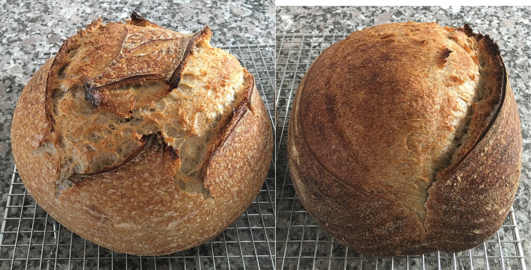 I baked the boule in a Dutch oven and the batard on a baking stone.  The lid stayed on the Dutch oven for the first twenty minutes, and the total bake was 44 minutes.  I use two aluminum pie pans filled with lava rocks to steam the oven with the baking stone, and the total bake for the batard was 40 minutes.  Here are the loaves.
