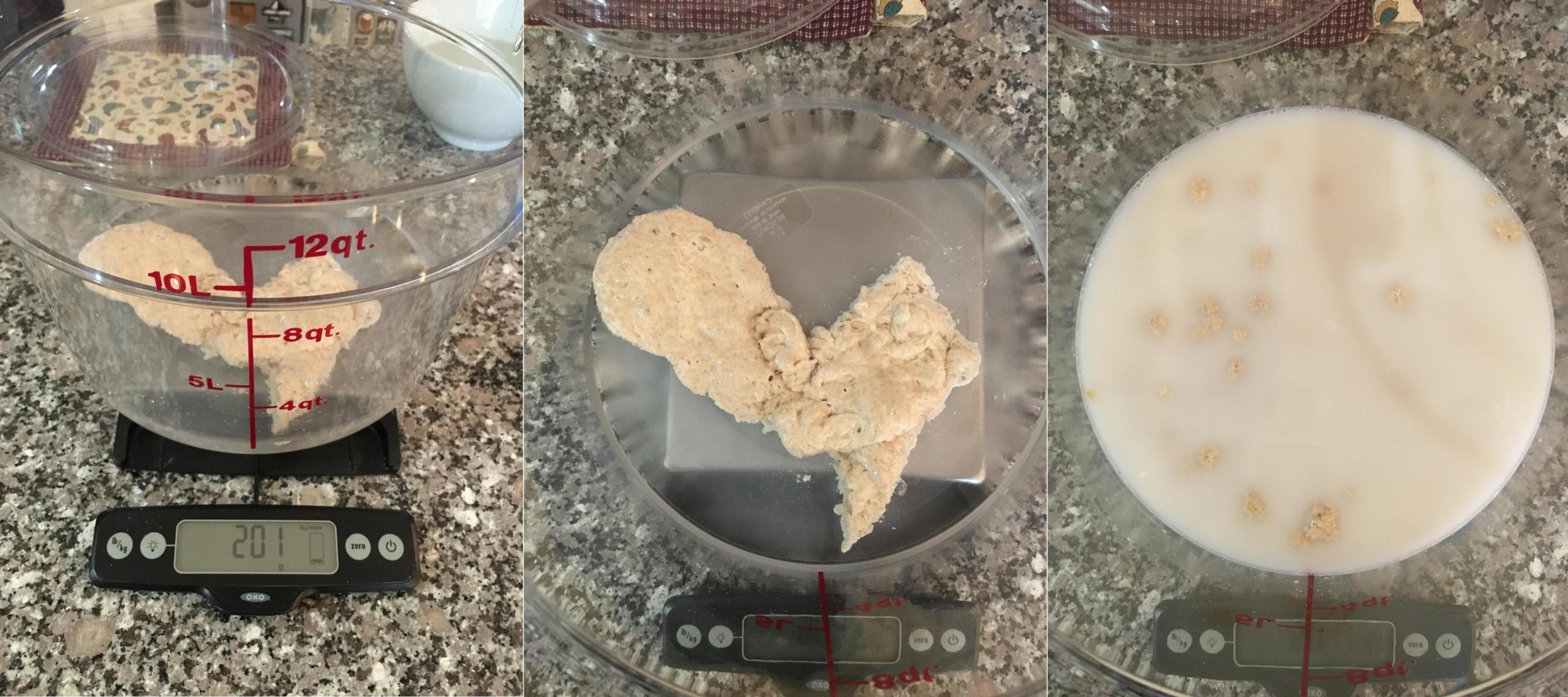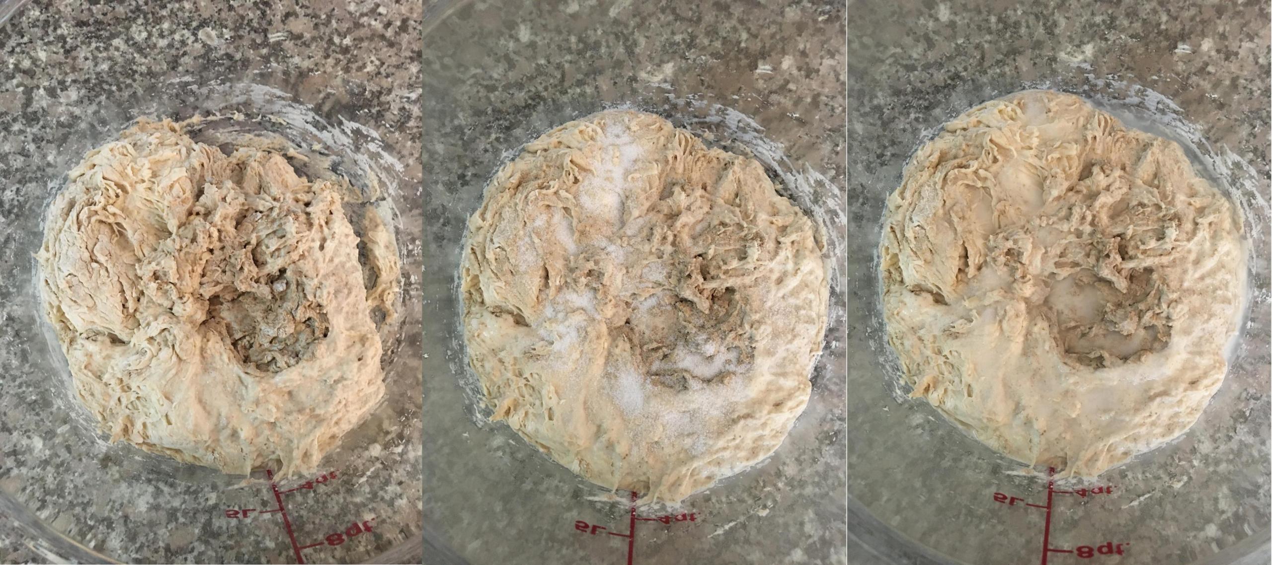 With no remaining dry flour, the mixture is ready for the autolyse stage.  I went for sixty minutes to give the gluten a chance to begin its formation.  This composite photo shows the dough mass at the beginning of the autolyse, at the end, and after the addition of the salt (20 g) and held-back water (50 g).