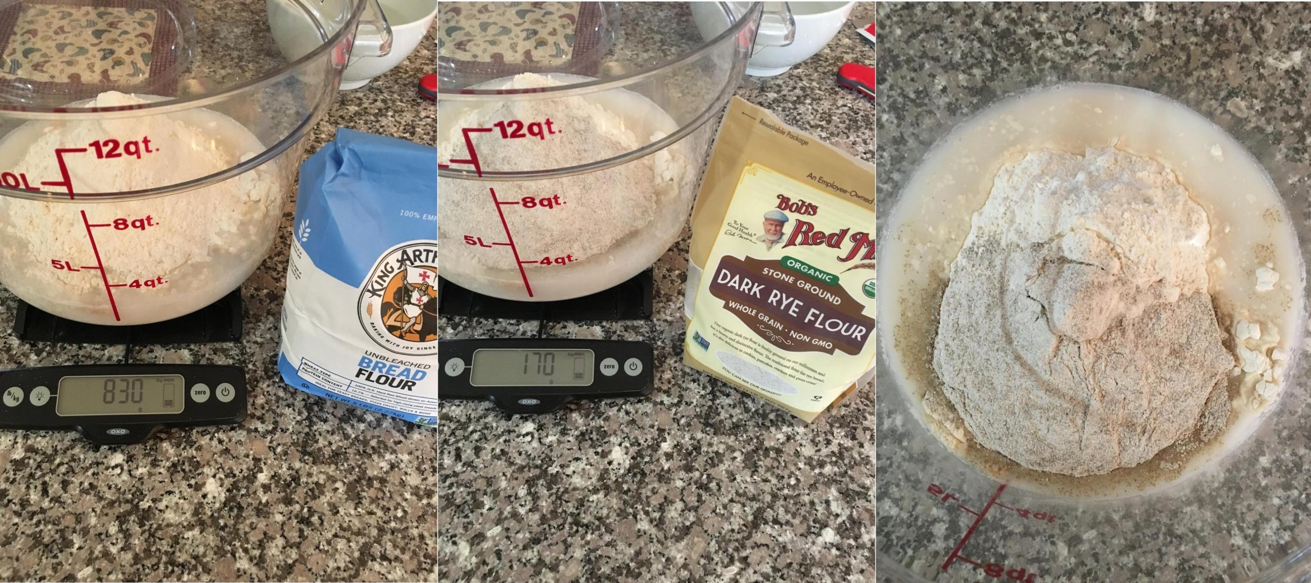 The flours are then added.  This bread is 83% bread flour and 17% whole rye.  The key at this stage is to get all of the flour wet, and a scraper helps to reach the dry flour at the bottom of my Cambro tub and distribute the water.