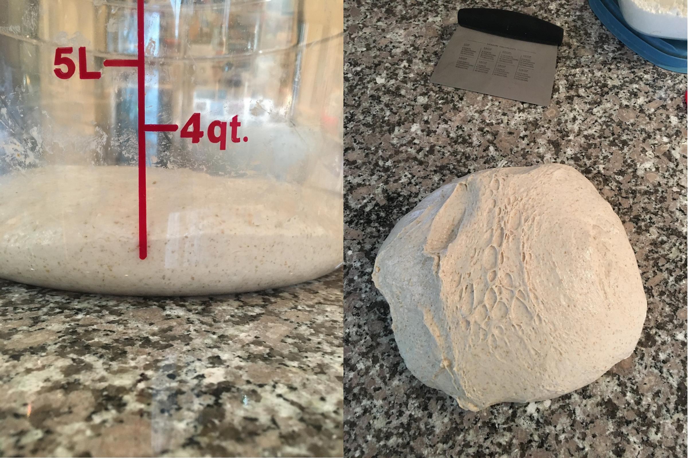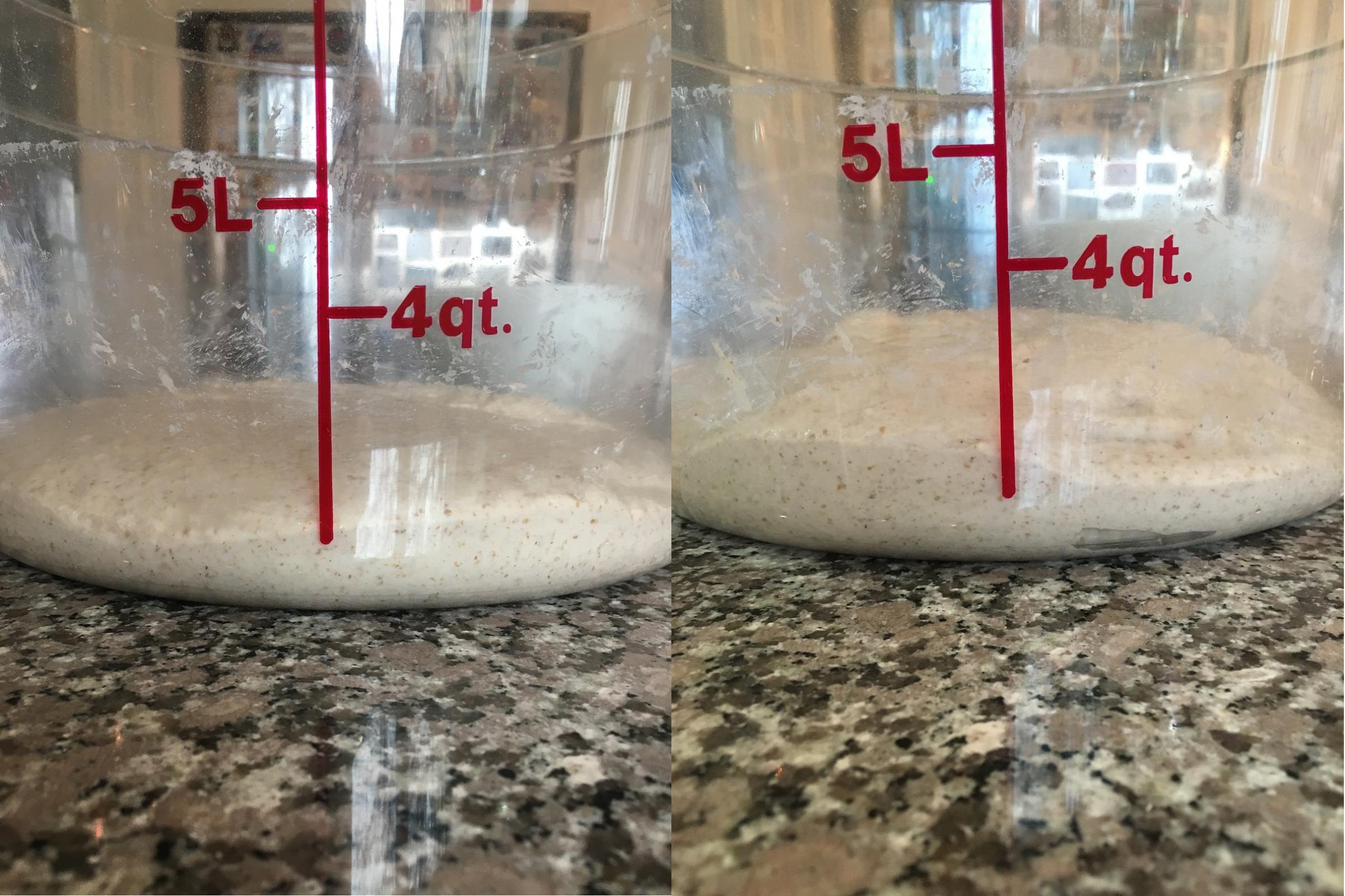 The recipe calls for four sets of stretch-and-folds (S&F) spaced thirty minutes apart.  This photo shows the dough just before the first and fourth of these sets, and the growth of the dough mass is evident.