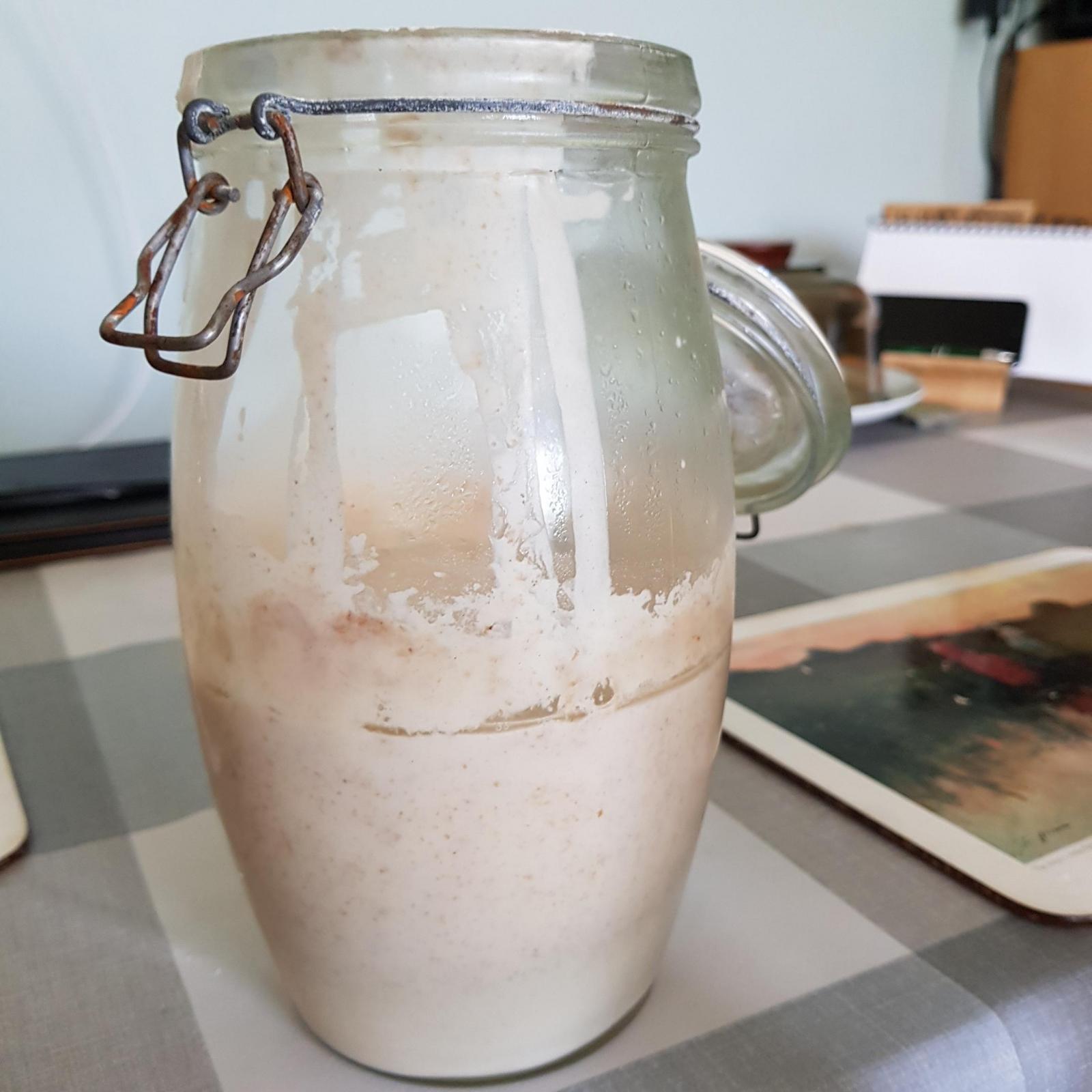 The starter was made over 6 days adding 50gr of strong bread flour and 50 gr of tepid water everyday. there was plenty of fermentation maybe too much as there was a brown liquid on top on day 5 so I just added flour on day 6.