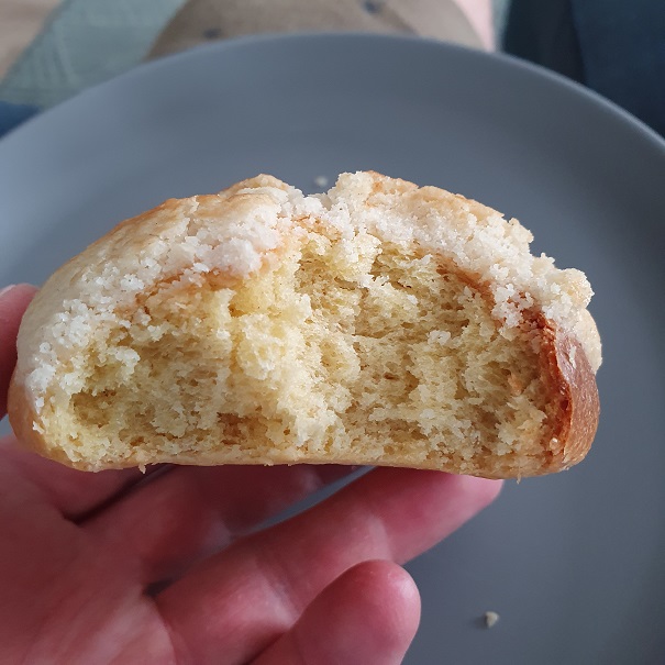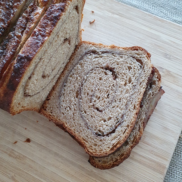 As you can see, it's a bit dense overall and underbaked around the filling. The top is also...not very appetizing-looking, lol. That said, it does taste good. I would make it again with some modifications (maybe splitting into 2 smaller loaves?, perhaps doing the full time for the final proof (I did 4 hours instead of 6 since it seemed ready at that point), ideally baking in a metal tin perhaps with a baking stone or something underneath to help it cook in the middle, and a change in the topping so it doesn't inhibit the oven spring).