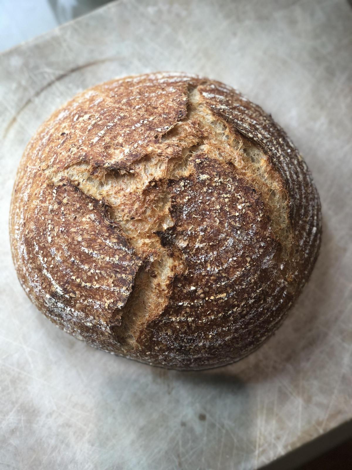 For my records I used : 146g overnight soaked chickpeas, 20g starter and 221g water. I also only have AP flour given quarantine and the run on flours so I tried to make up my own whole wheat flour. I read that whole wheat flour has 14.5% bran, 2.5% germ and 83% endosperm. Lucky for me I had some bran and germ in the freezer so I made up my own whole wheat. So no whole spelt nor dark rye per the original. So I used 328.4g ap flour, 9.2g germ and 26.4g bran to make up a 1/2 AP and 1/2 whole wheat blend total of 365g flour. I added 79g water in addition to the soaker water. 24 hours after the soaker was made (5pm) I made the dough, bulked for 4 hours at 74 and then shaped it into a basket. Into the fridge and baked the next morning about 12 hours later. I think I could have pushed hydration as this was a stiffer dough.
