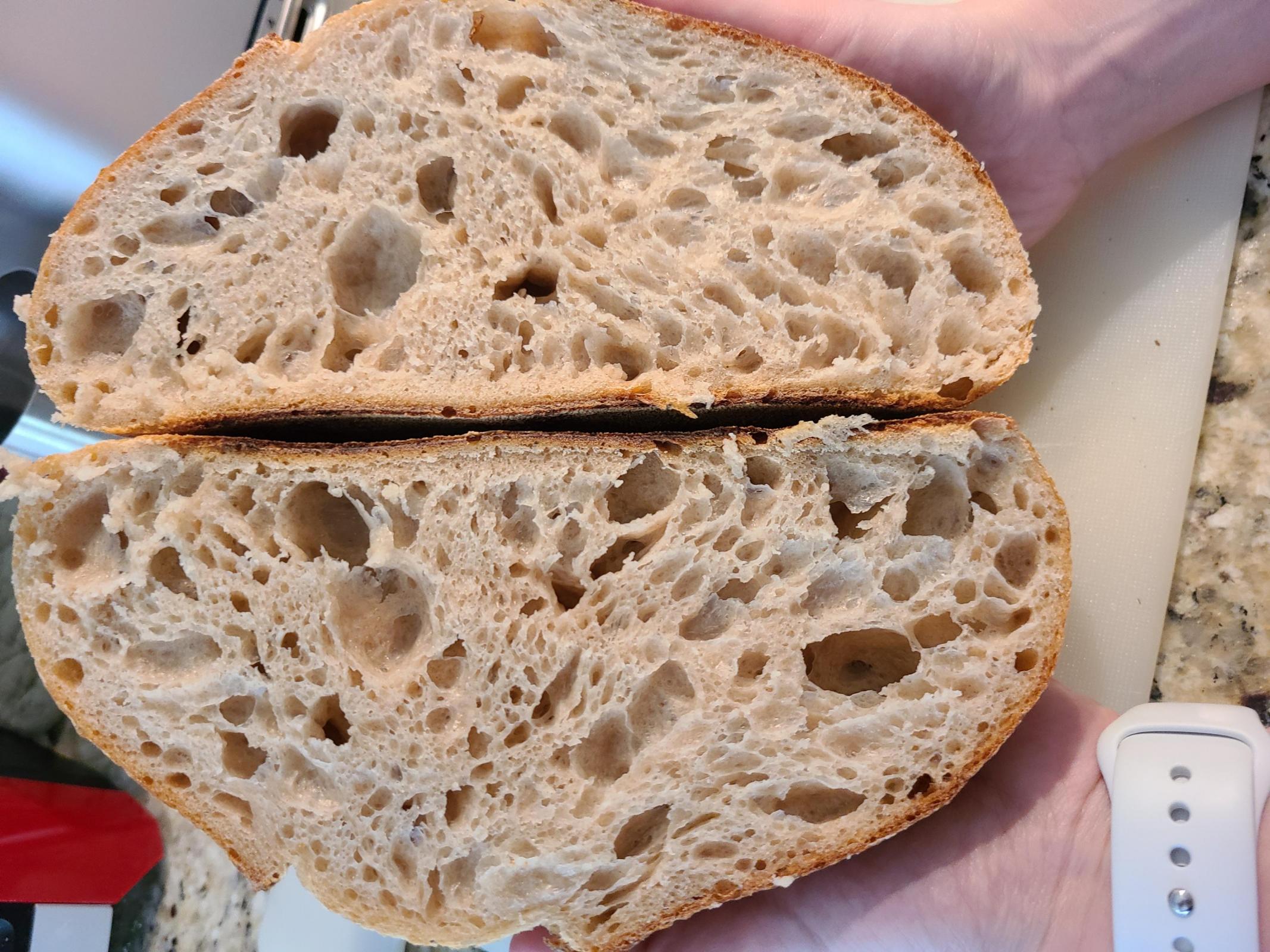I got a nice loaf that also tastes great. Unfortunately, it was a bit "sticky" on the inside, especially around the holes. Any tips on what I may have done wrong? Perhaps it's over fermented?