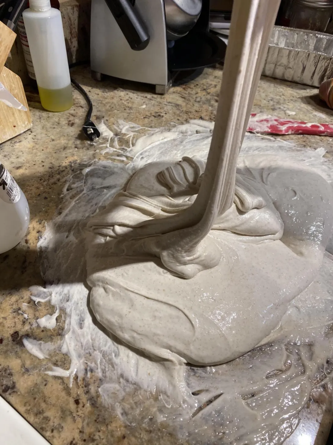 I’m so sorry about your dough & your kitchen...and your clothes...and your hair. But, I must congratulate you on getting that picture! That’s the kind of picture that’s definitely worth a thousand words. If I ever wondered what taffy-like bread dough looked like, I can wonder, no longer. Thank you for sharing.