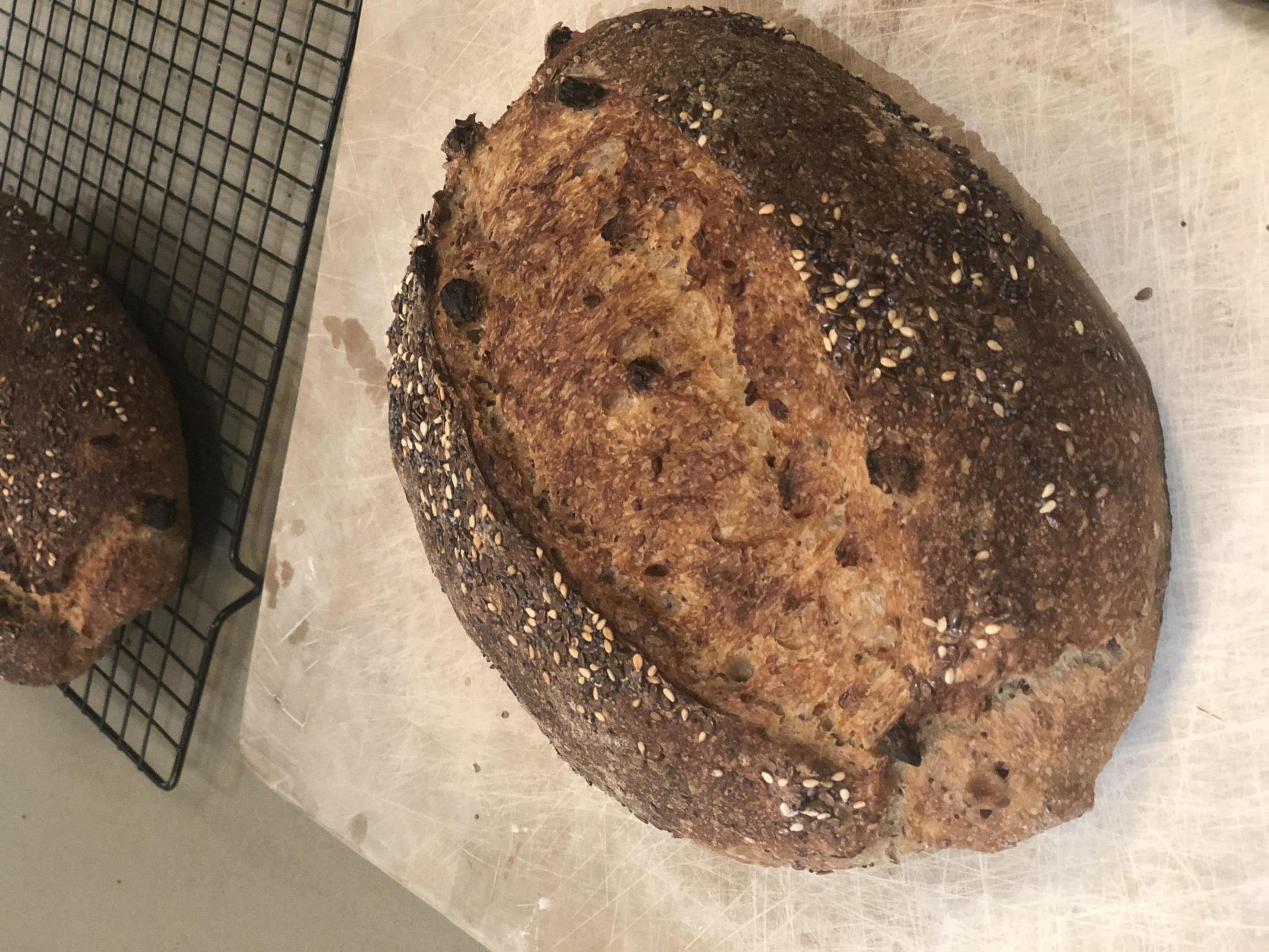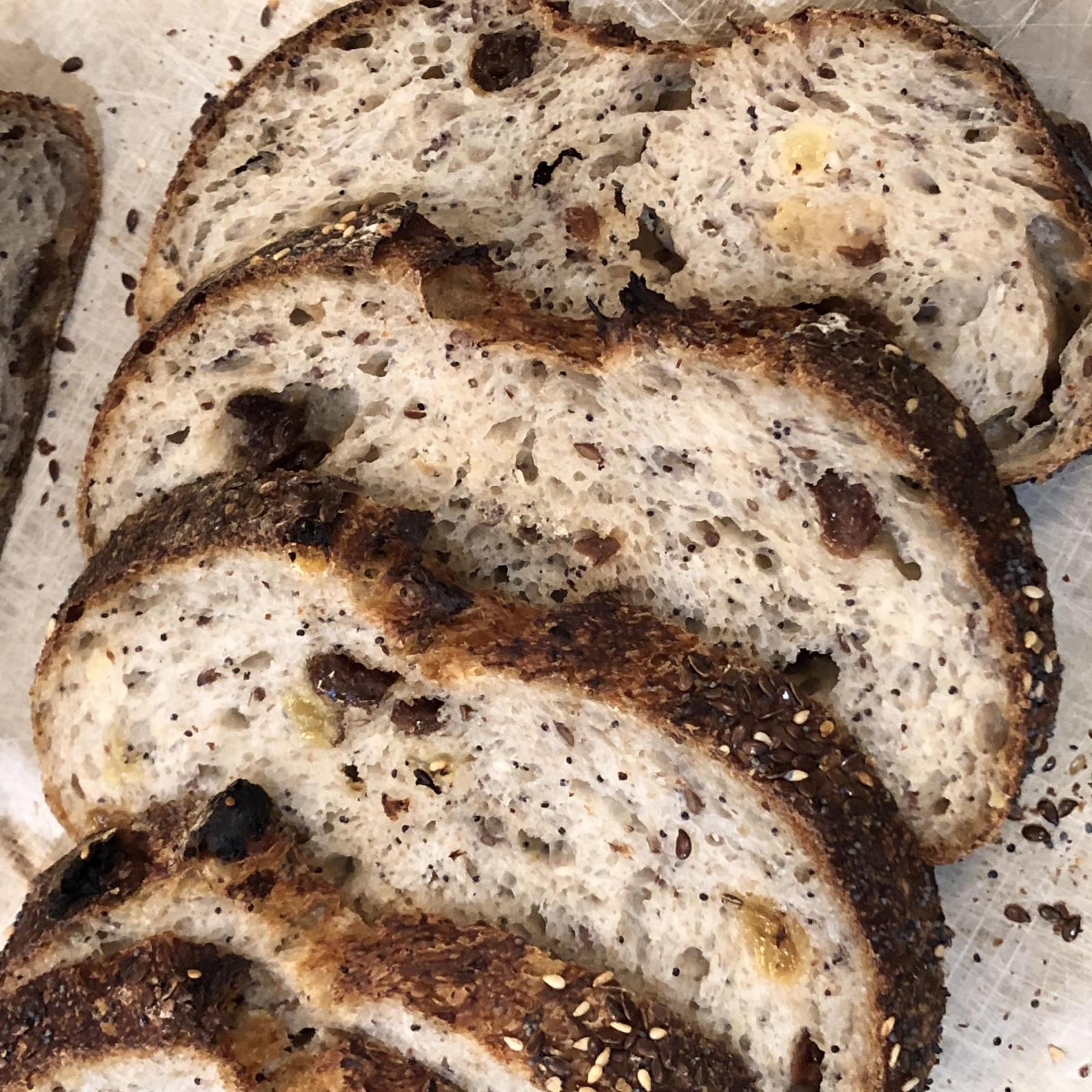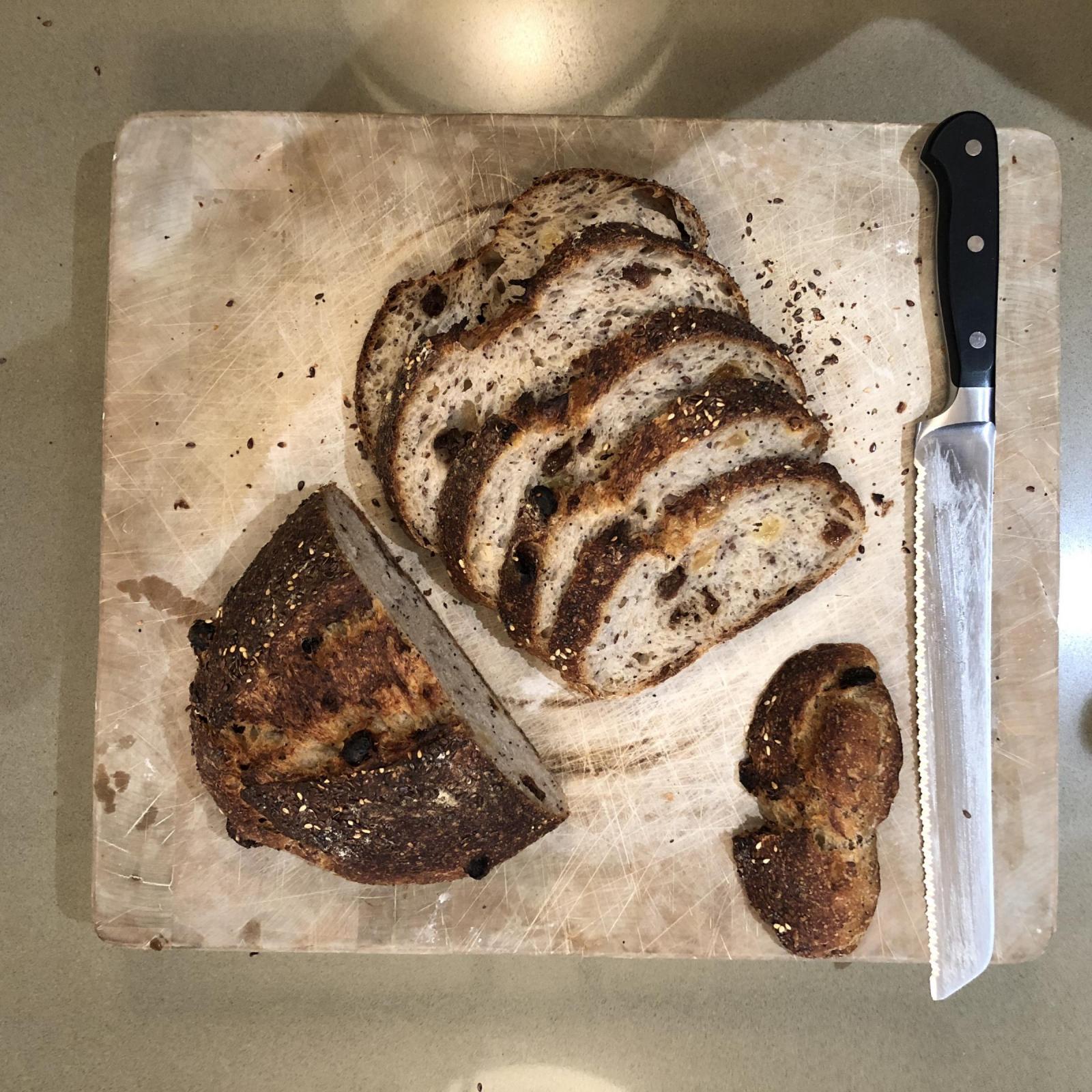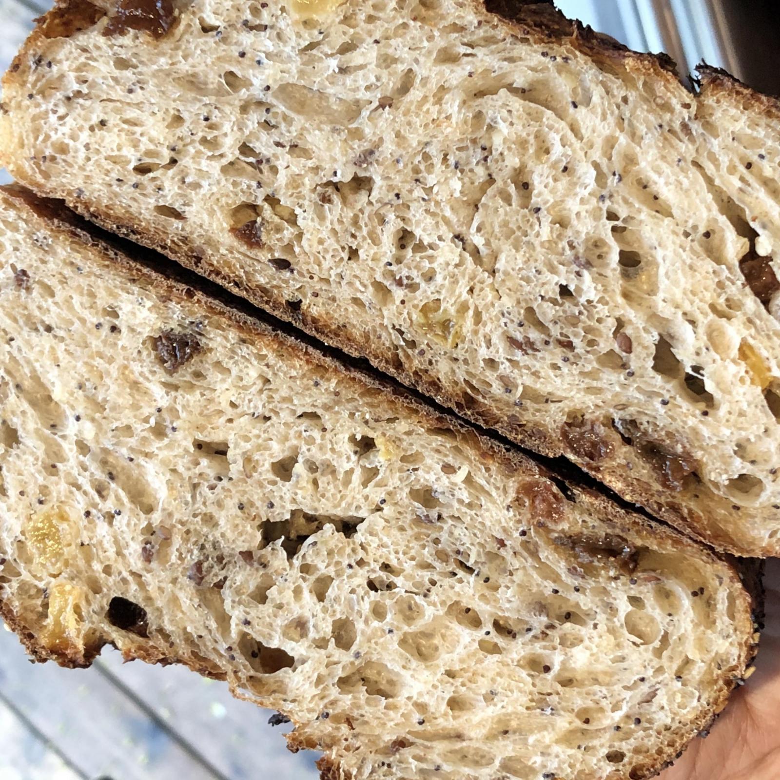 Mixed water not used for oats with rest of cooled oats to break them apart, then added starter to incorporate well.  Then added starter and let rest. Half an hour later added salt and mixed for 7 minutes on medium. Let rest for half an hour and added salt and honey, mixed for a few minutes. Fifteen minutes later added seeds and raisins. Let rest for half an hour. Tried to mix to get window pain but wasn't possible. The dough never really came together in a proper sense but did hold shape eventually with coil folds. The starter was active at the start but proof at 74 degrees was very slow. It took closer to 6 hours to get a good rise out of the dough (at which point I shaped) and towards the end cranked up the proofer to 78 degrees. I think I had far too much oats and would next time use half the amount. Again, the flour used was a commercial AP flour which I think is impacting some recent bakes.  I had to push hydration to 100% because the dough was dry at first. The oats took up a lot more water than I realized.